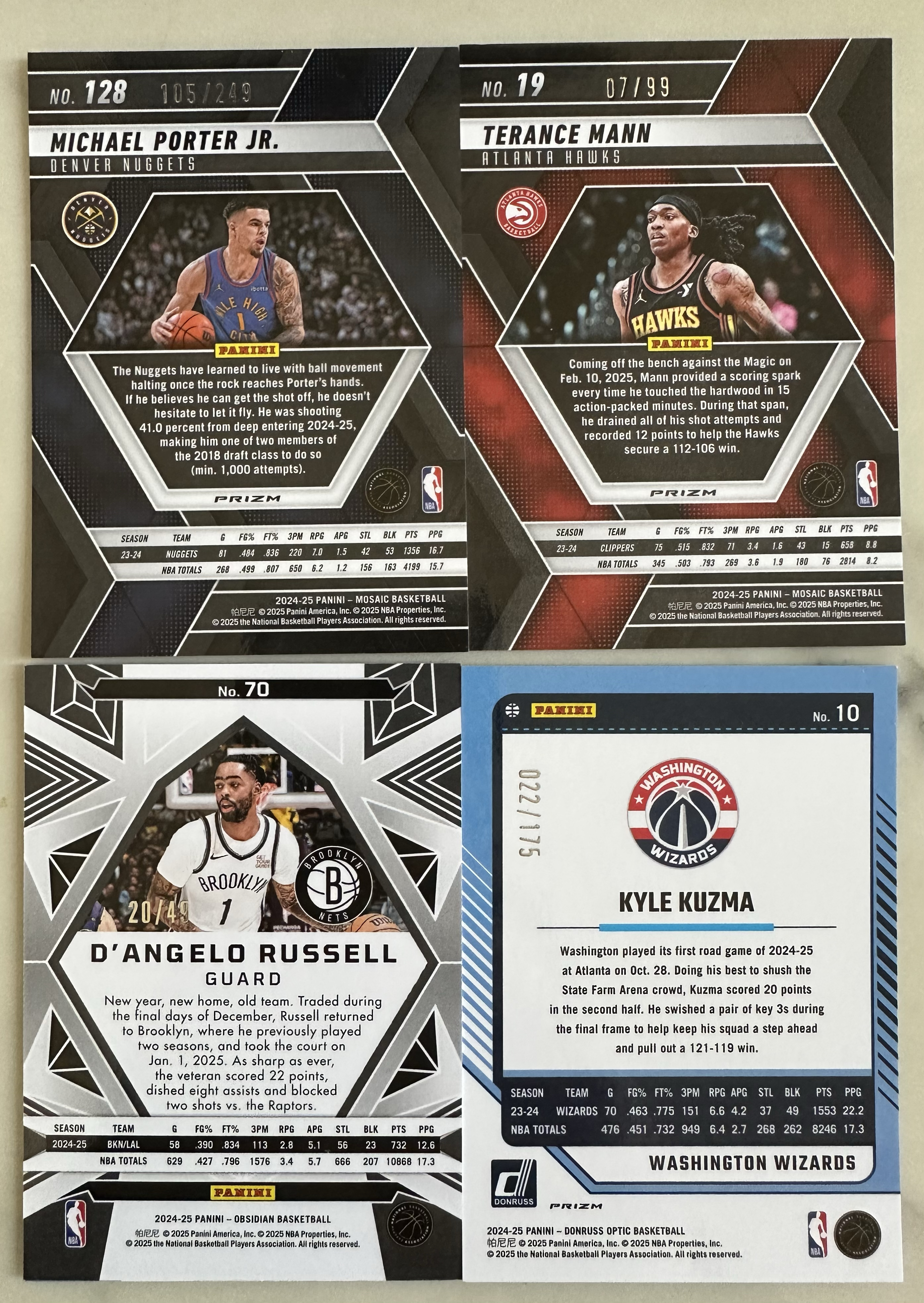 2025 Panini Mosaic Michael Porter Jr. 迈克尔 波特 249编 曼恩 99编 拉塞尔 49编 库兹马 175编 4张打包 不保卡品 卡量稀少 凑套必备(黄总01)