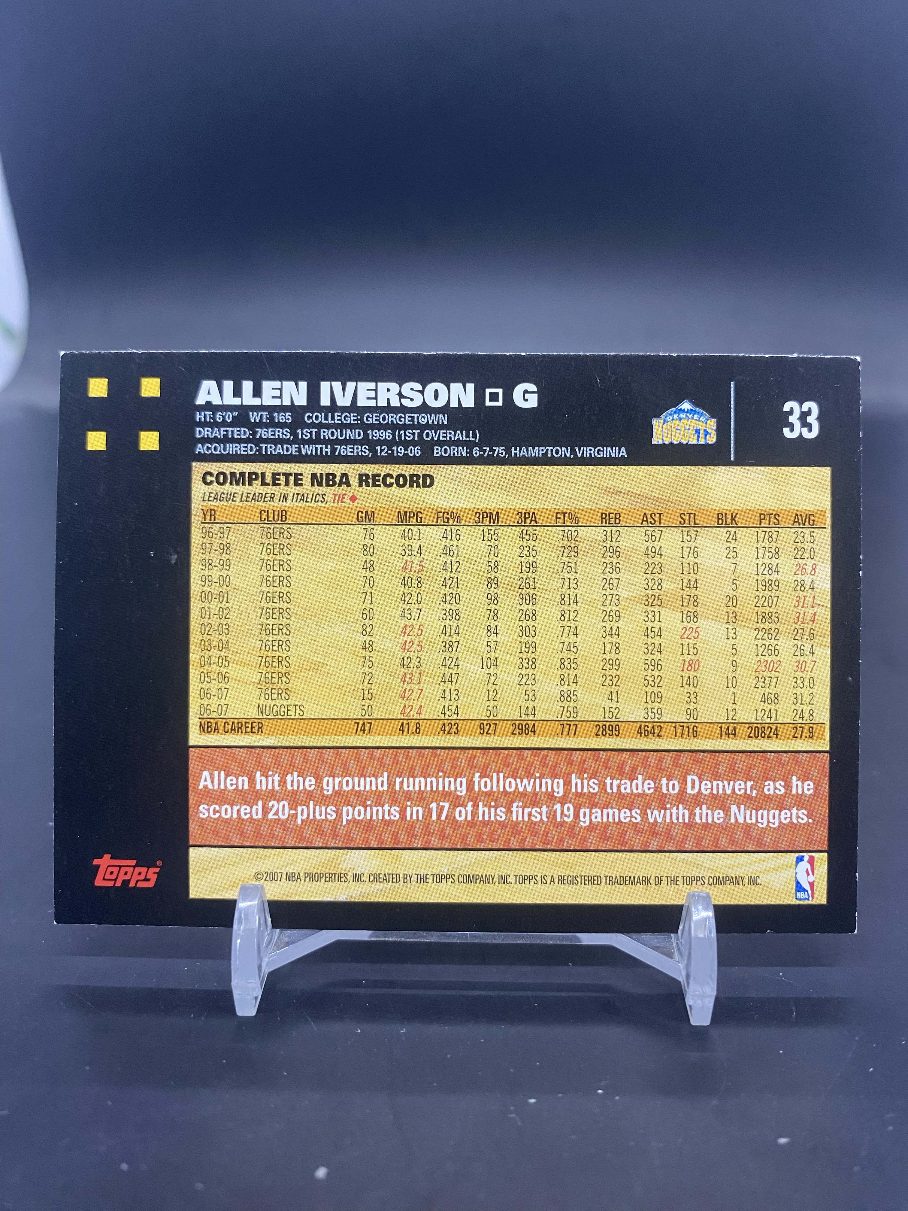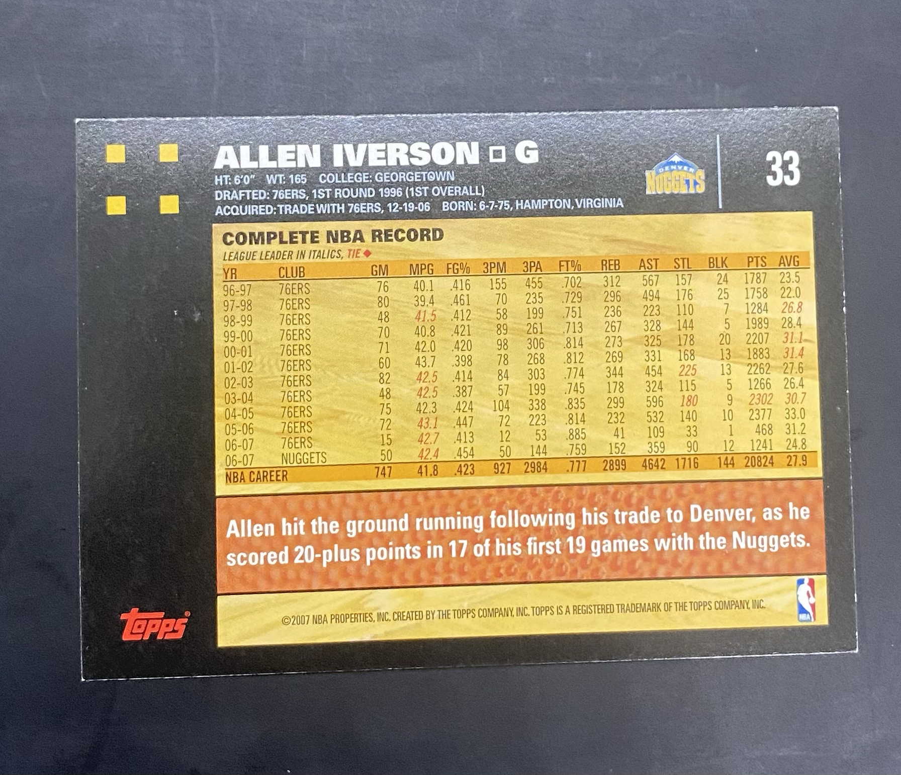 2007 Topps Beach Boys 50th Anniversary Allen Iverson 掘金 阿伦 艾弗森 答案AI 横版 场边特卡 角白 瑕疵如图(黄)