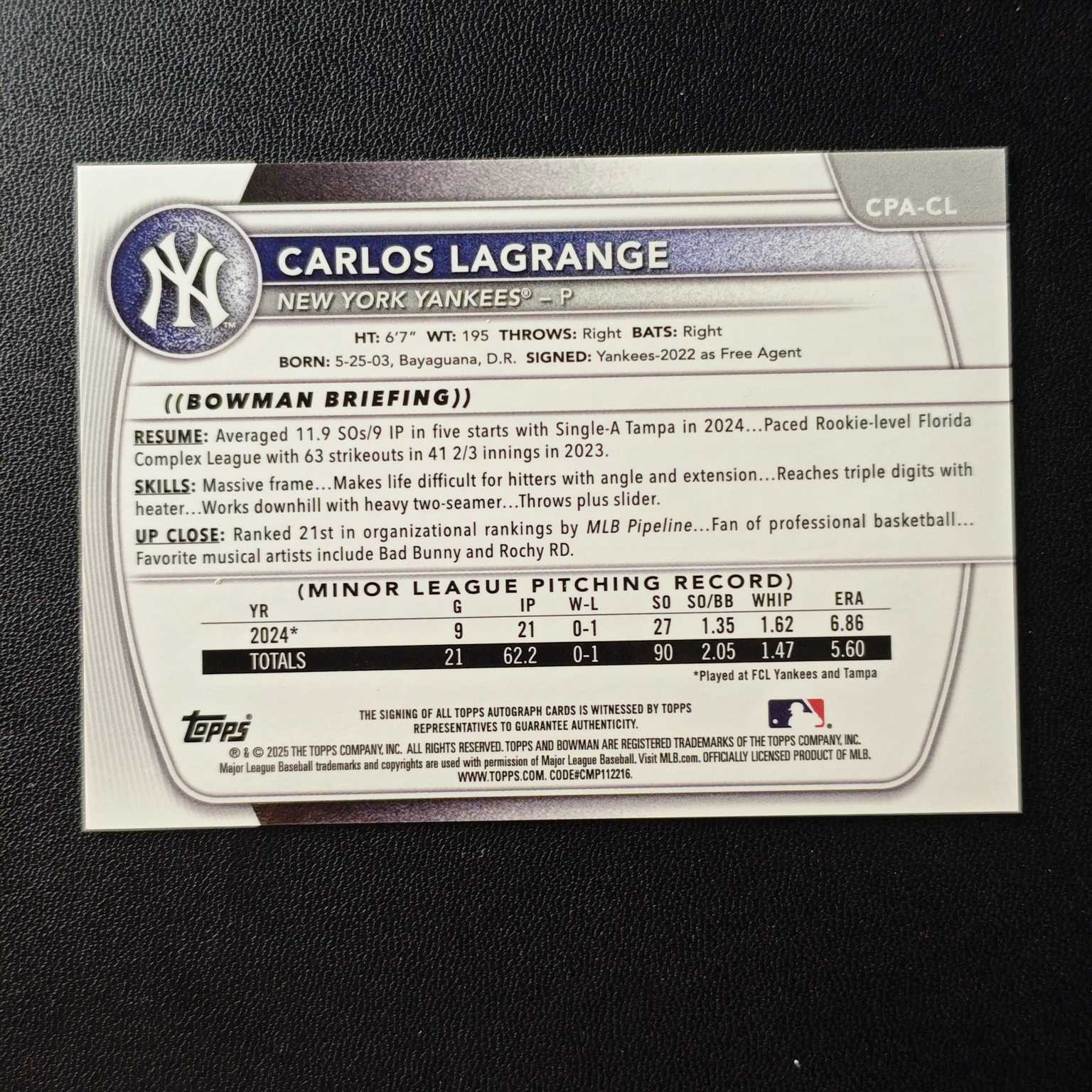 2025 Topps Bowman Chrome Carlos lagrange RC 新秀 1st 卡签 签字卡 卡洛斯 朗格若 纽约扬基(阿火)【JS卡牌潮玩】(卡品如图)