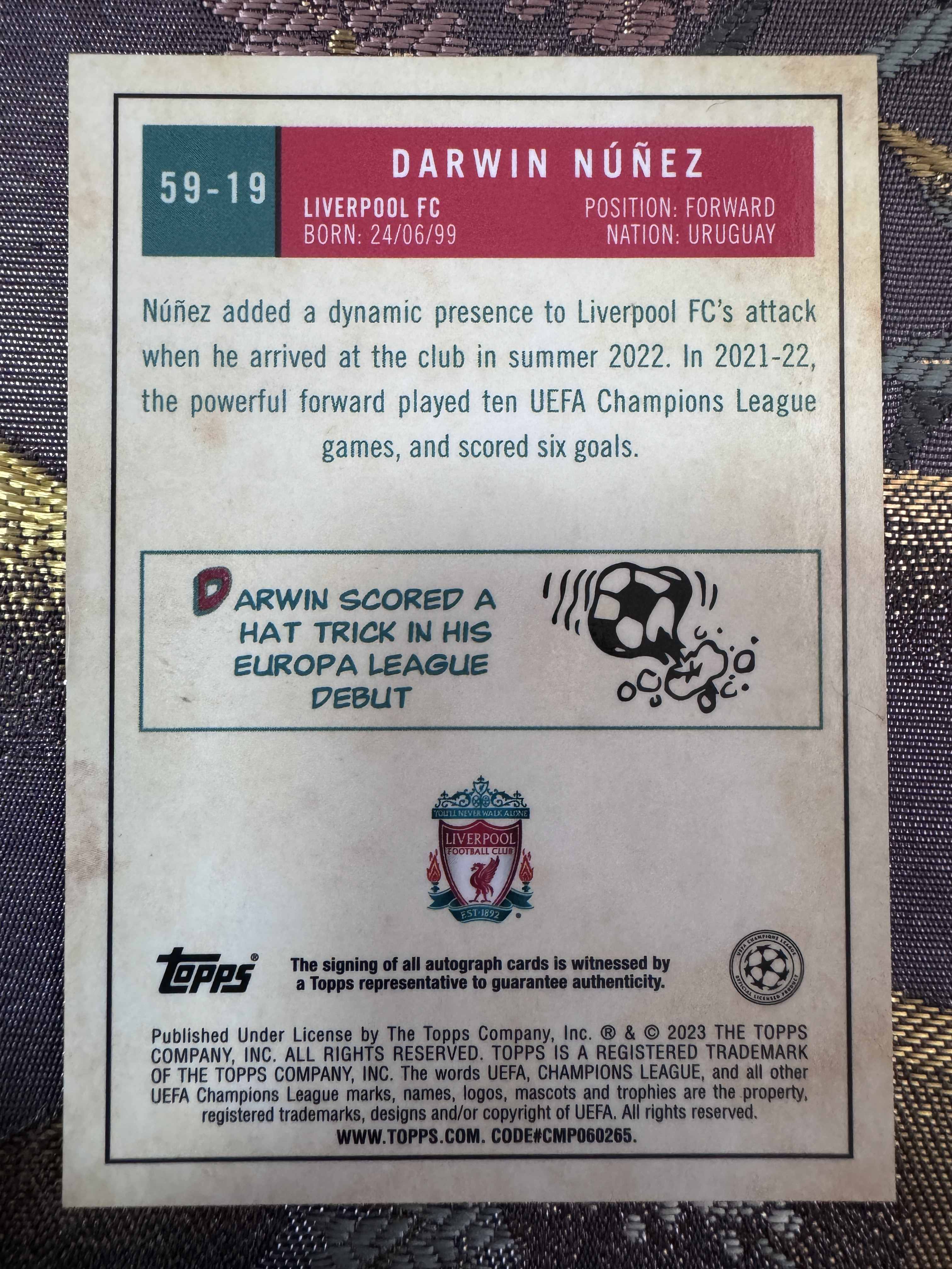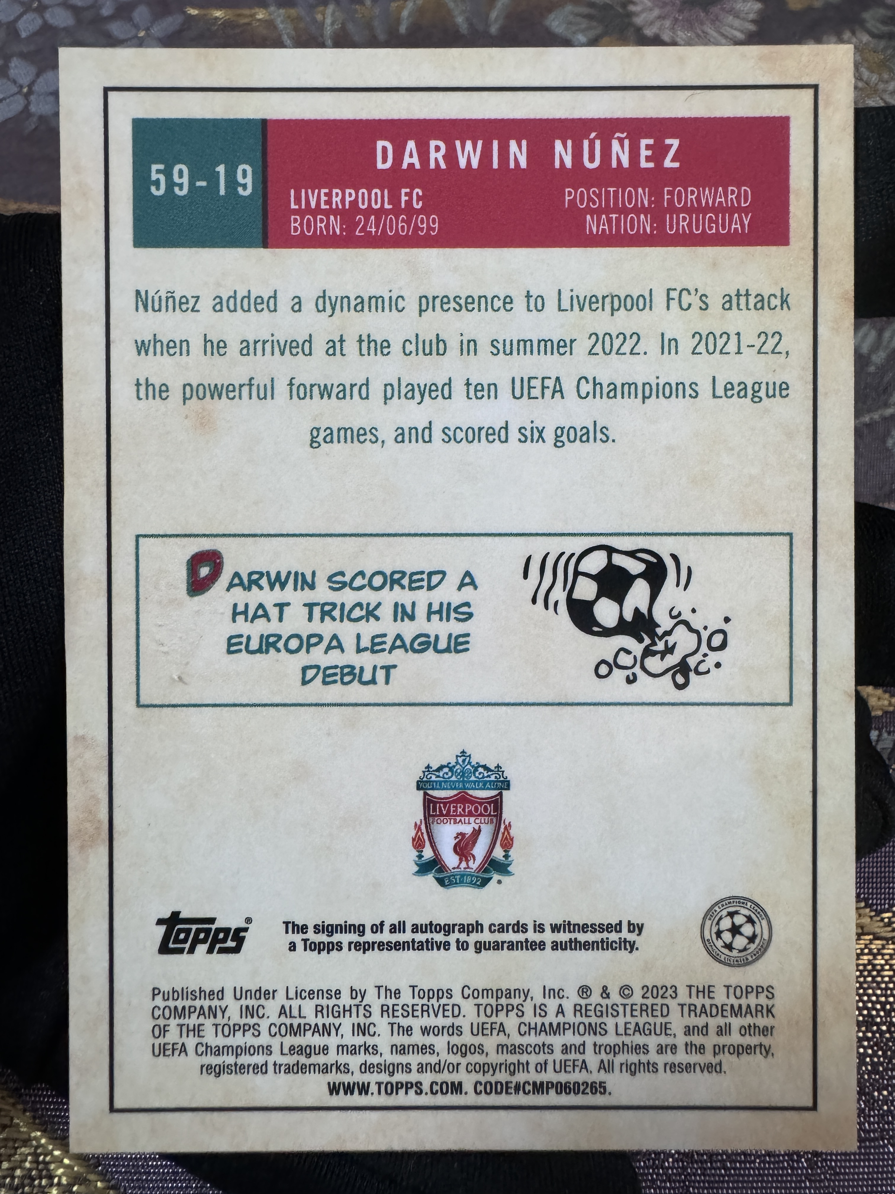 2023 Topps Chrome Darwin Nunez 【澈梦北霄】欧冠 chrome 红军 利物浦 乌拉圭 顶级射手 达尔文 努涅斯 超级巨星 复古 大头签 银折签 签字 完美墨迹 实卡精美