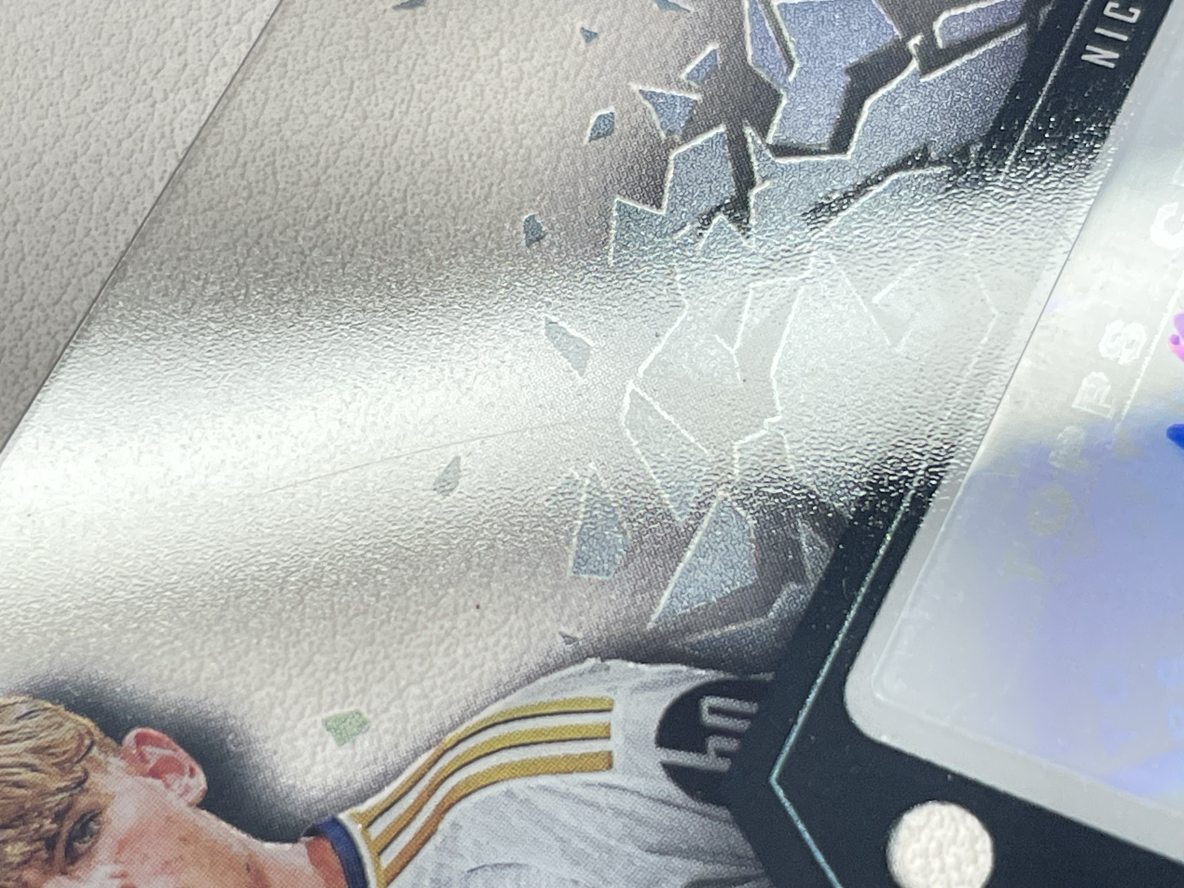 厚卡系列,轻微白边白角属于正常现象!镜面系列等卡面轻印划痕、印刷自带痕迹或覆膜不平起泡等卡片自身问题均为通行品。老卡有白边白角属于正常卡品。原封砖,评级卡砖上的划痕和轻微破损以及评级砖内的卡有卡品问题一律不属于品相问题。折射(薄卡)系列表面的轻微划痕为正常卡品,正反面“竖线/横线”属于印刷线,并不影响评级结果。