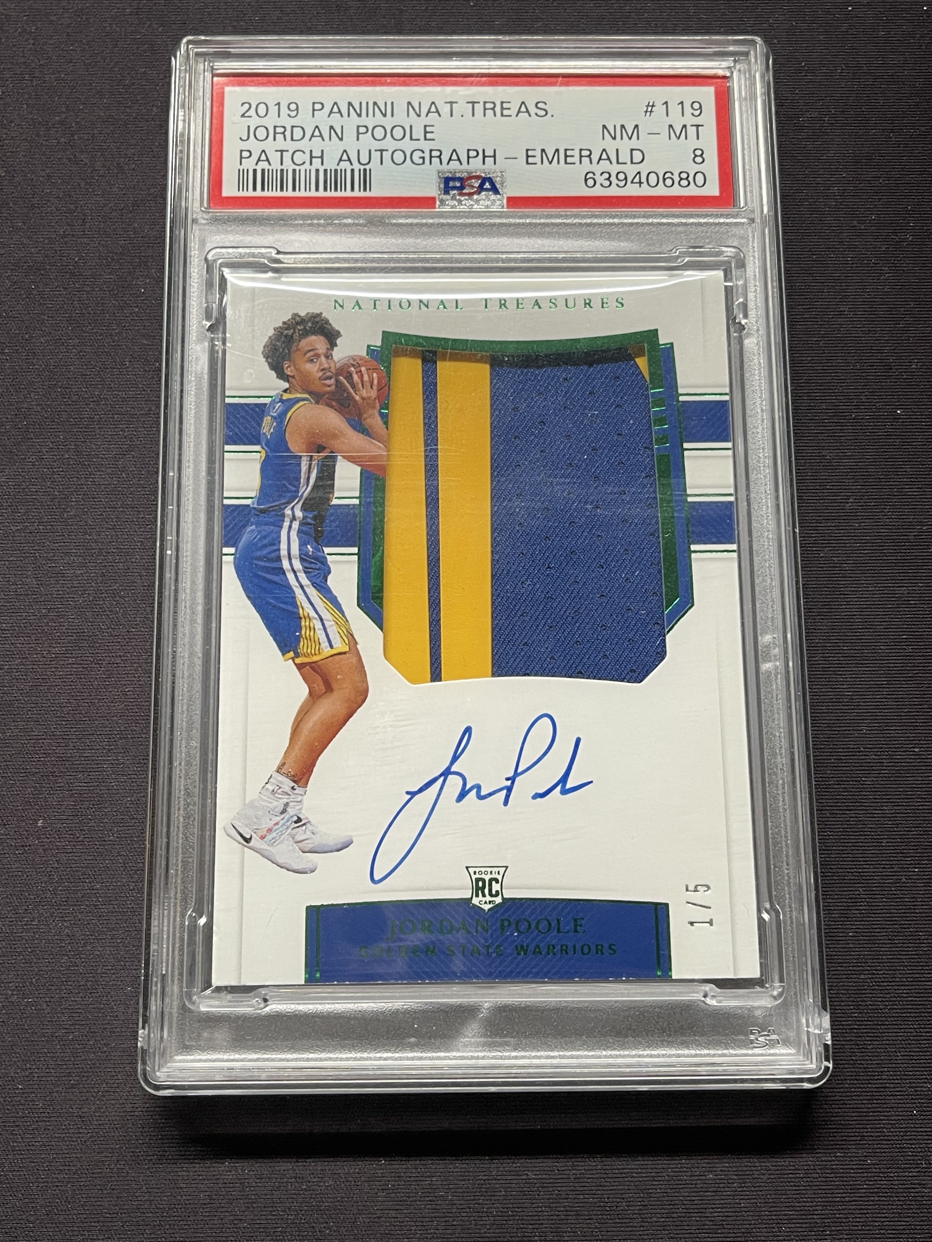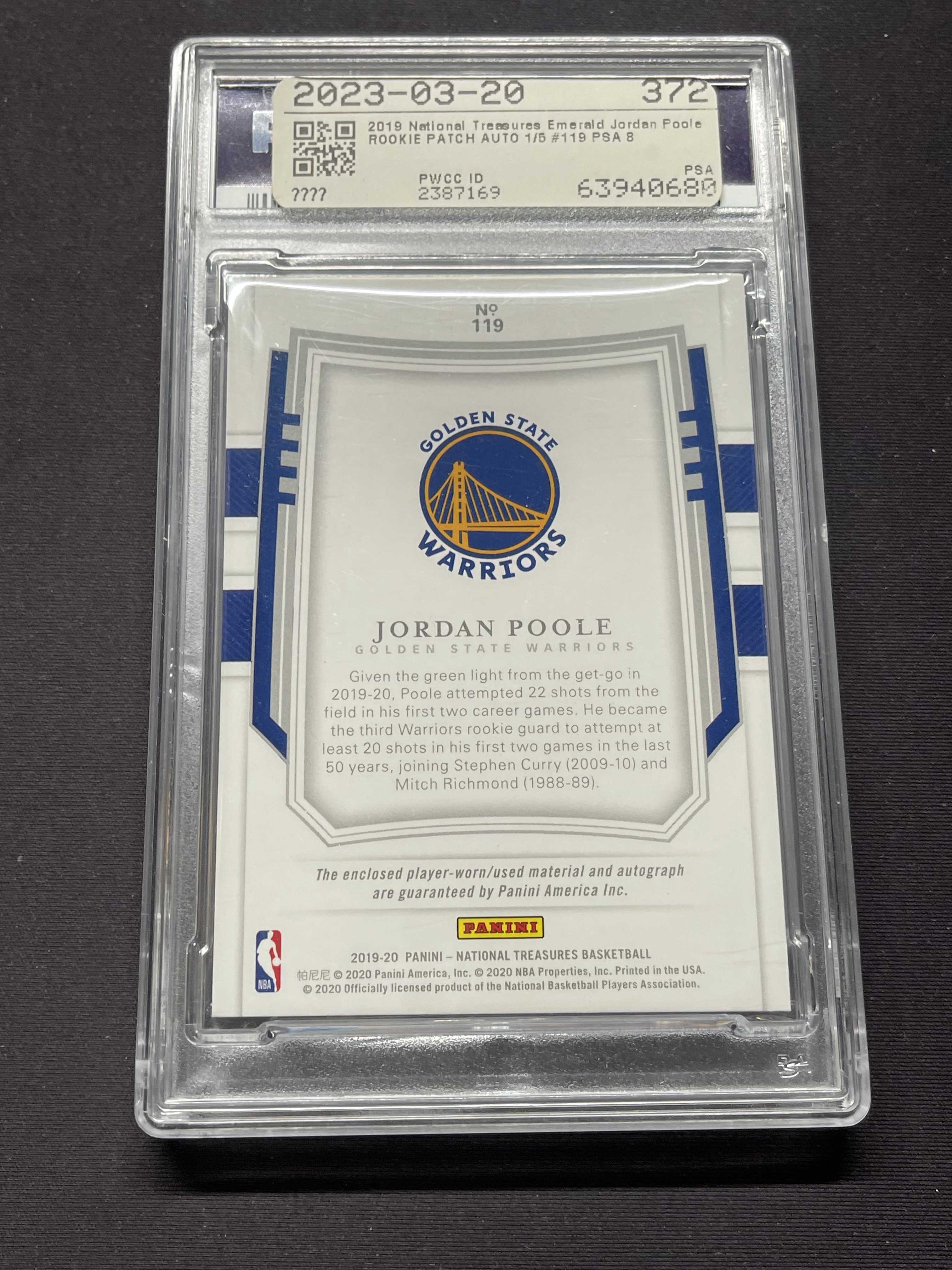 2019-20 Panini National Treasures Jordan Poole RC 国宝 勇士 乔丹普尔 新秀patch签字卡签 RPA 1/5编 首编 绿版 PSA8「老夫子」JS