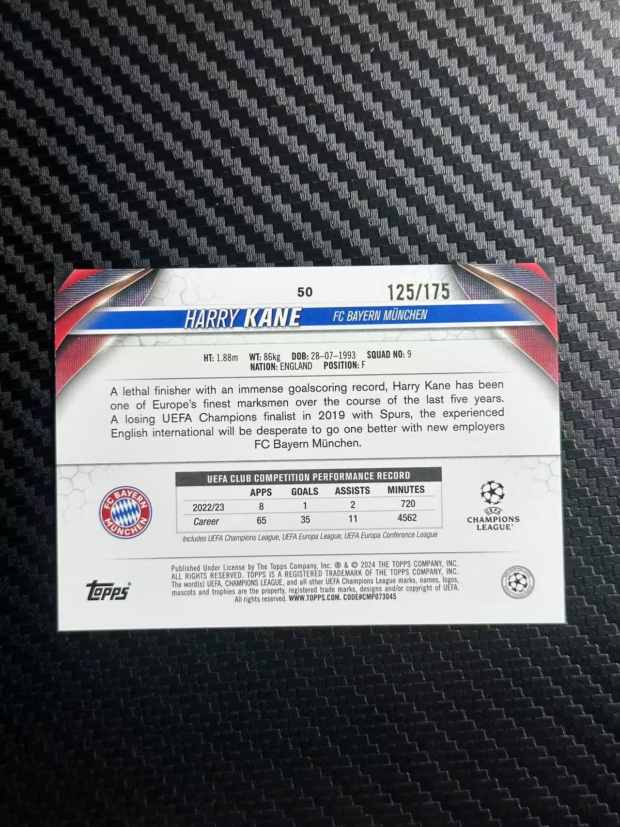 2024 Topps UCC Harry Kane 哈里 凯恩 拜仁慕尼黑 英格兰 欧冠 碧玉 125/175编 蓝玉折 卡品如图 拍前看描述