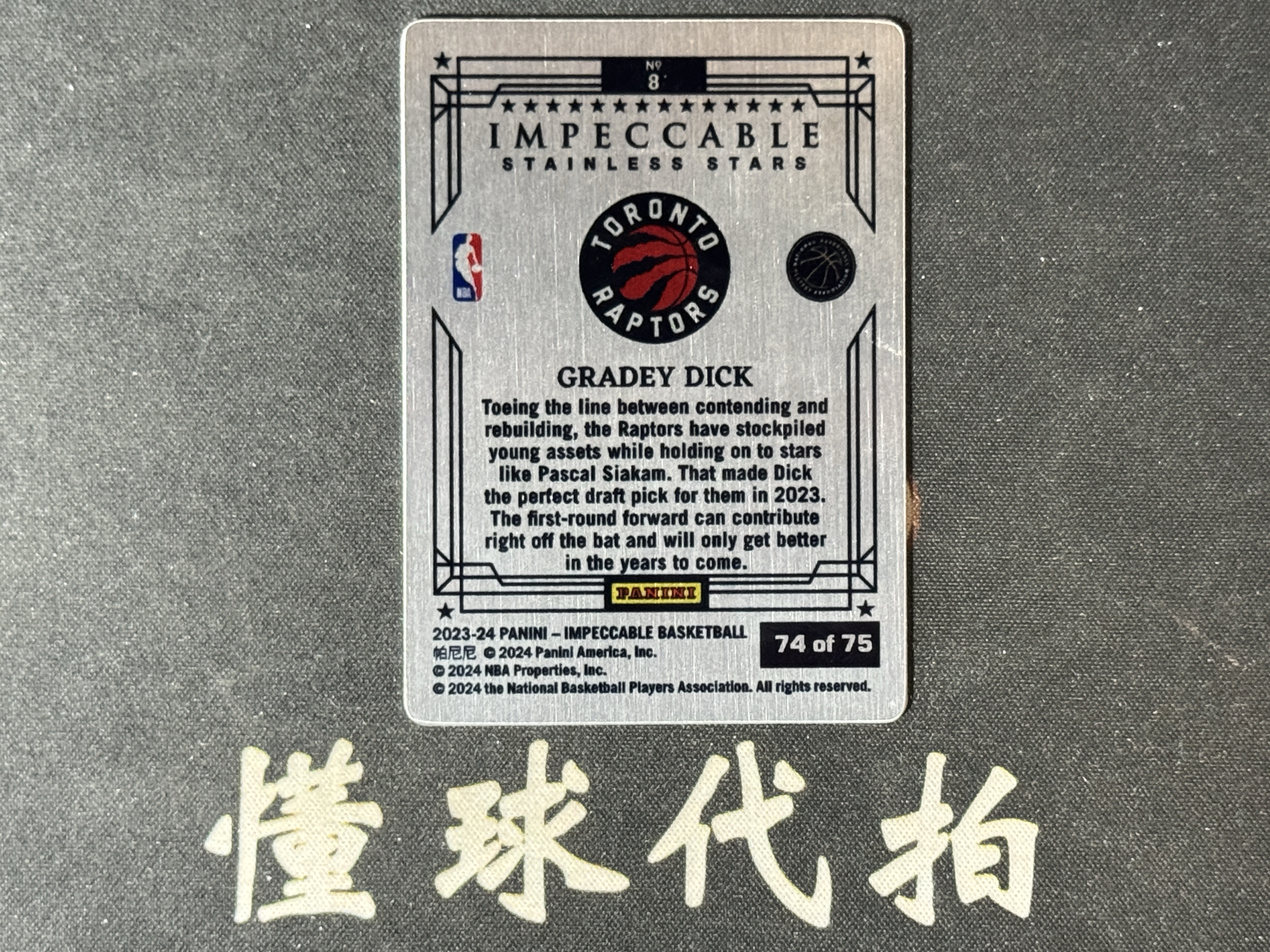 【懂球代拍】2023-24 panini 小真金impeccable RC新秀 限量 75编 GRADEY DICK格雷迪 迪克 猛龙 铁板 值得收藏 DQ079I 003
