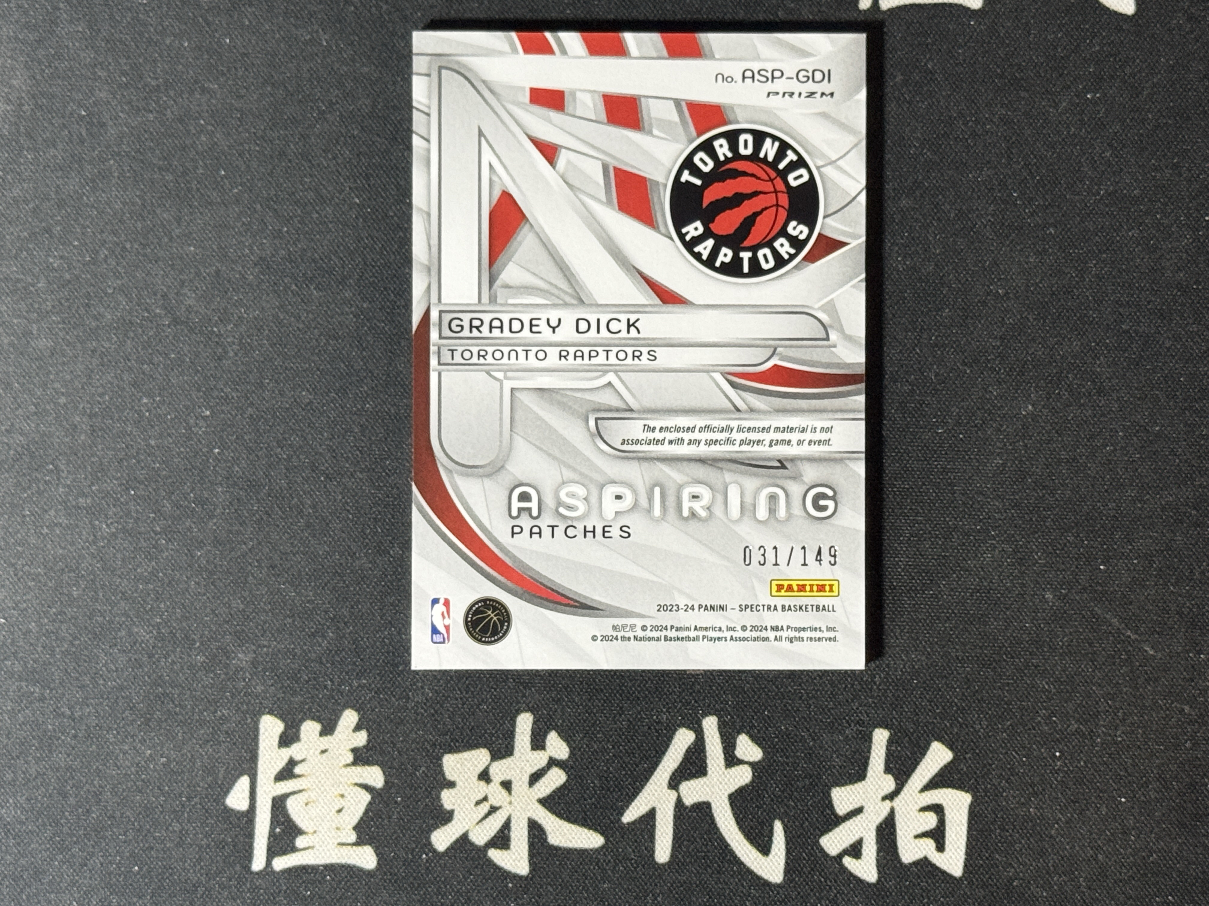 【懂球代拍】2023-24 panini spectra光谱 149编 RC新秀 GRADEY DICK格雷迪 迪克 猛龙 新秀RP 暴力三色球衣patch切割 折射 值得收藏 DQ079I 024