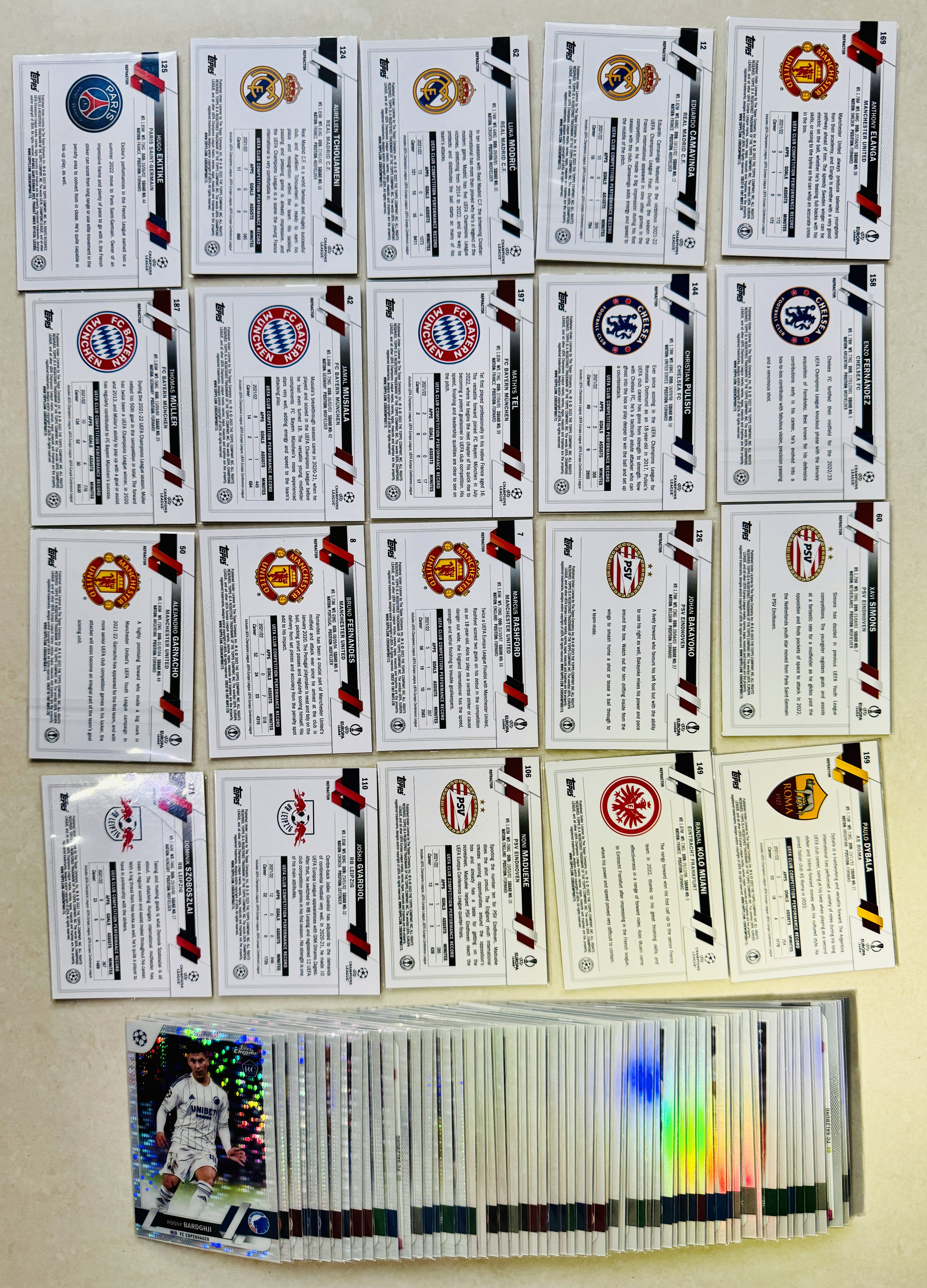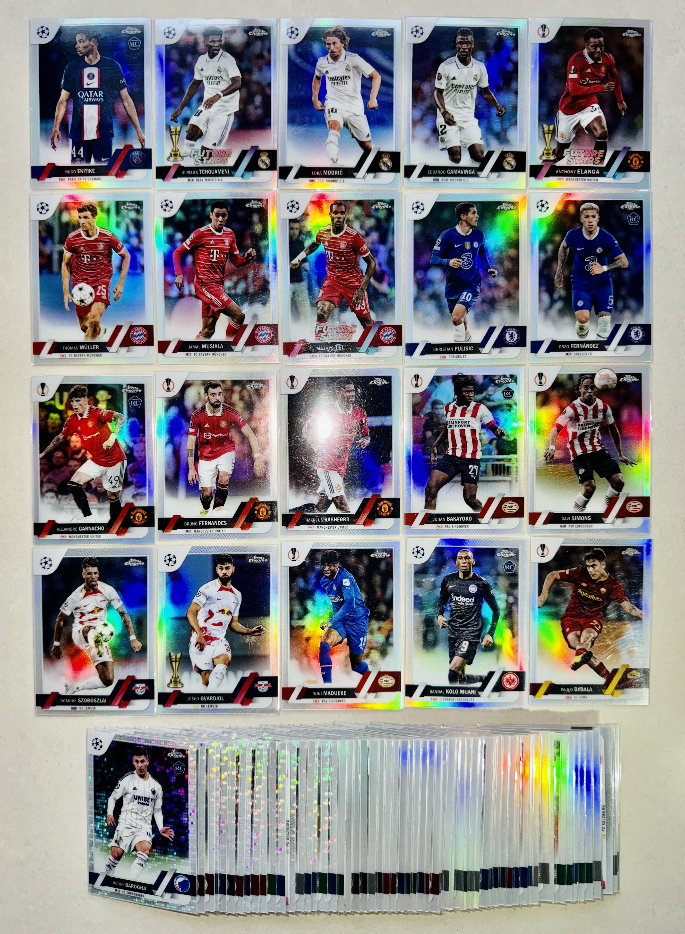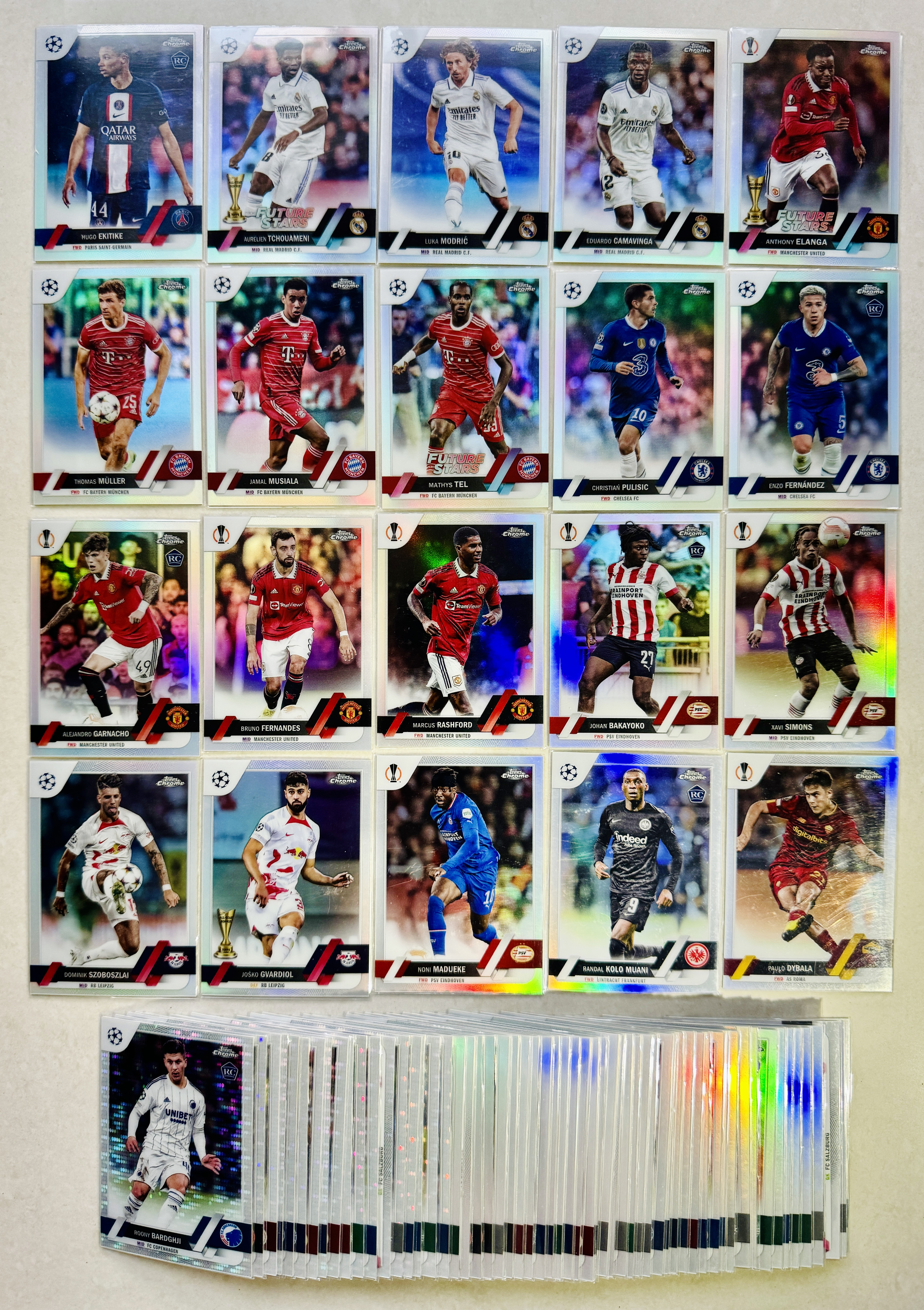 2023 Topps Chrome 欧战 新秀 RC 大巴黎巴萨皇马拜仁利物浦切尔西尤文 埃基蒂克 莫德里奇 埃兰加 穆勒 穆西亚拉 恩佐 加纳乔 拉什福德 西蒙斯 索博等银脉冲鱼鳞银折78张不保卡品