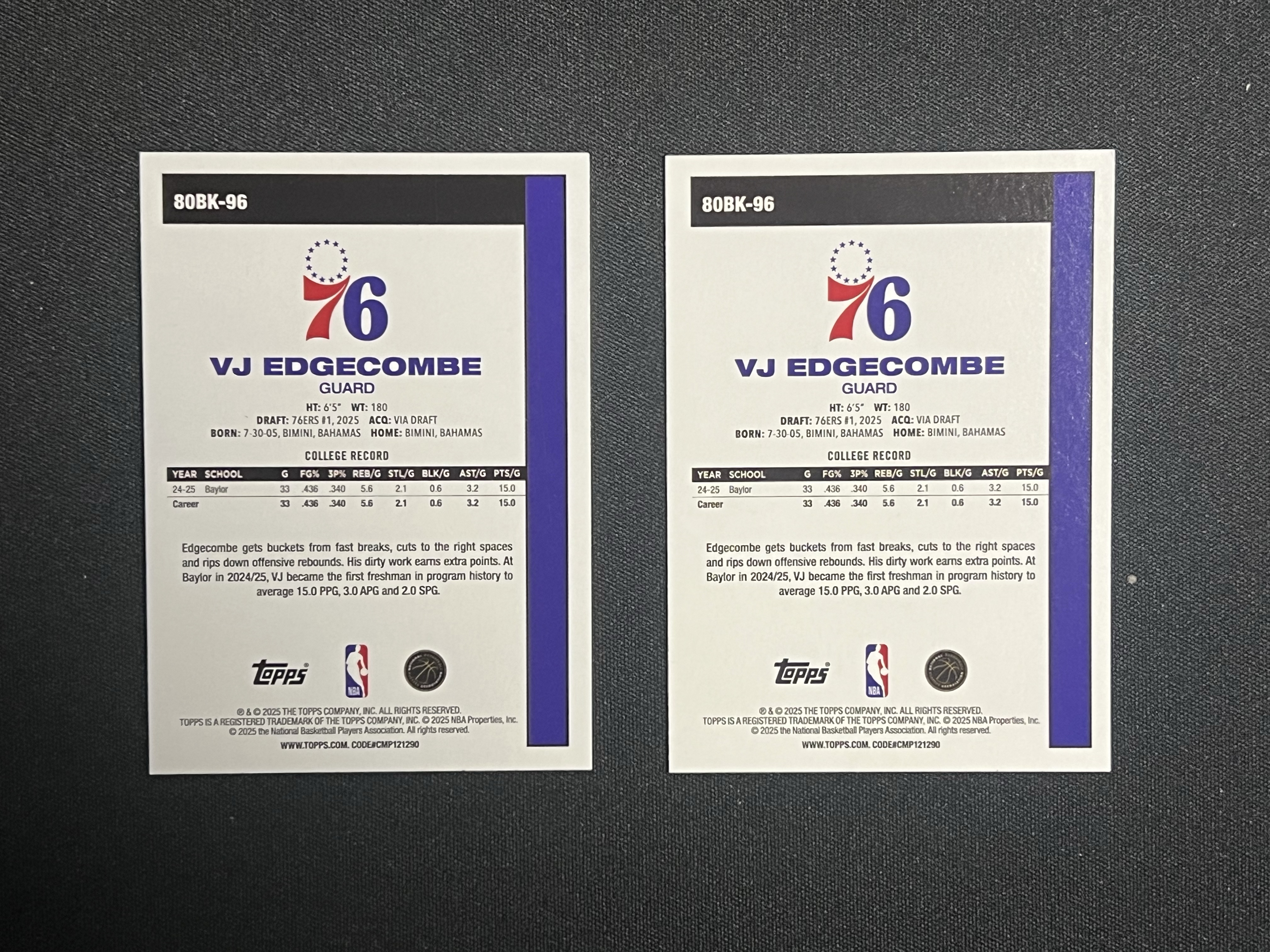 【卡卡星拍卖】2025 Topps Topps VJ Edgecombe RC 76人 VJ 埃奇库姆 新秀 特卡 复古base 2张打包 未来可期 卡品如图 唐叁