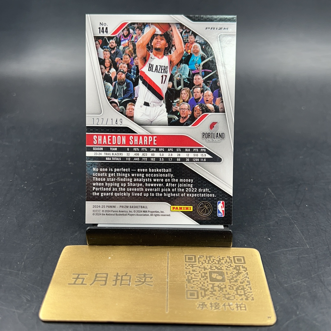 2024-25 Panini Prizm Shaedon Sharpe 【五月拍卖 顺丰空运】Pz 开拓者 谢登 夏普 带编 149编 紫碎冰折 收藏必备 塘桥不死鸟x35