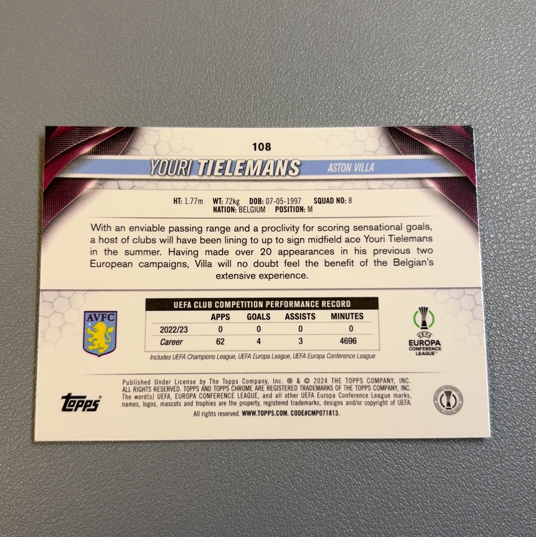 【风速狗】2023-24 Topps Sapphire Chrome 欧冠 蓝宝石 Youri Tielemans 阿斯顿维拉 尤里 蒂勒曼斯 9/75编 黄碎冰 路