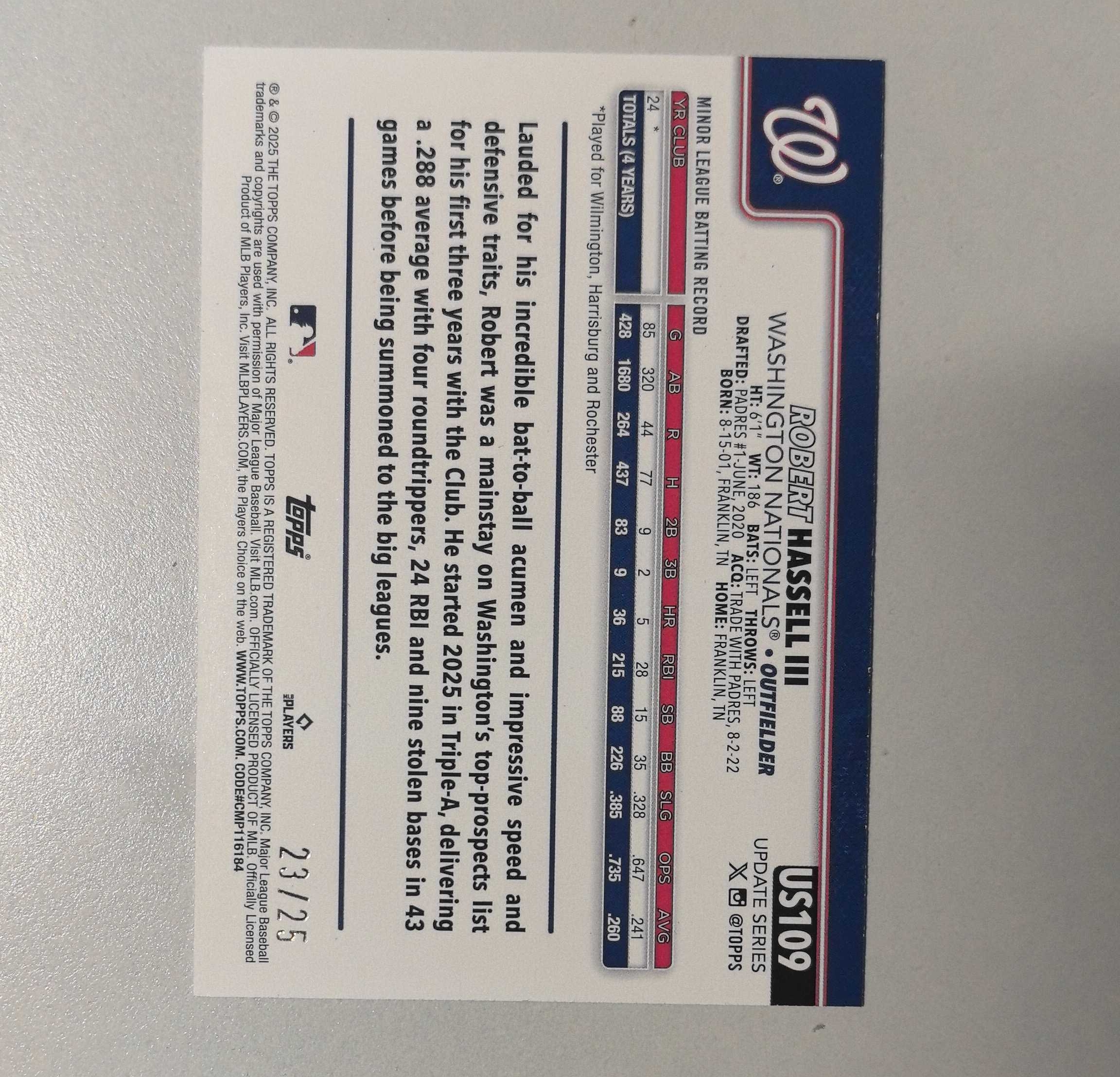 2025 Topps 【锡安代卖】 累计照常 棒球mlb series update 25编迷彩平行 华盛顿国民热门新秀 Robert Hassell 卡品如图 飞机盒