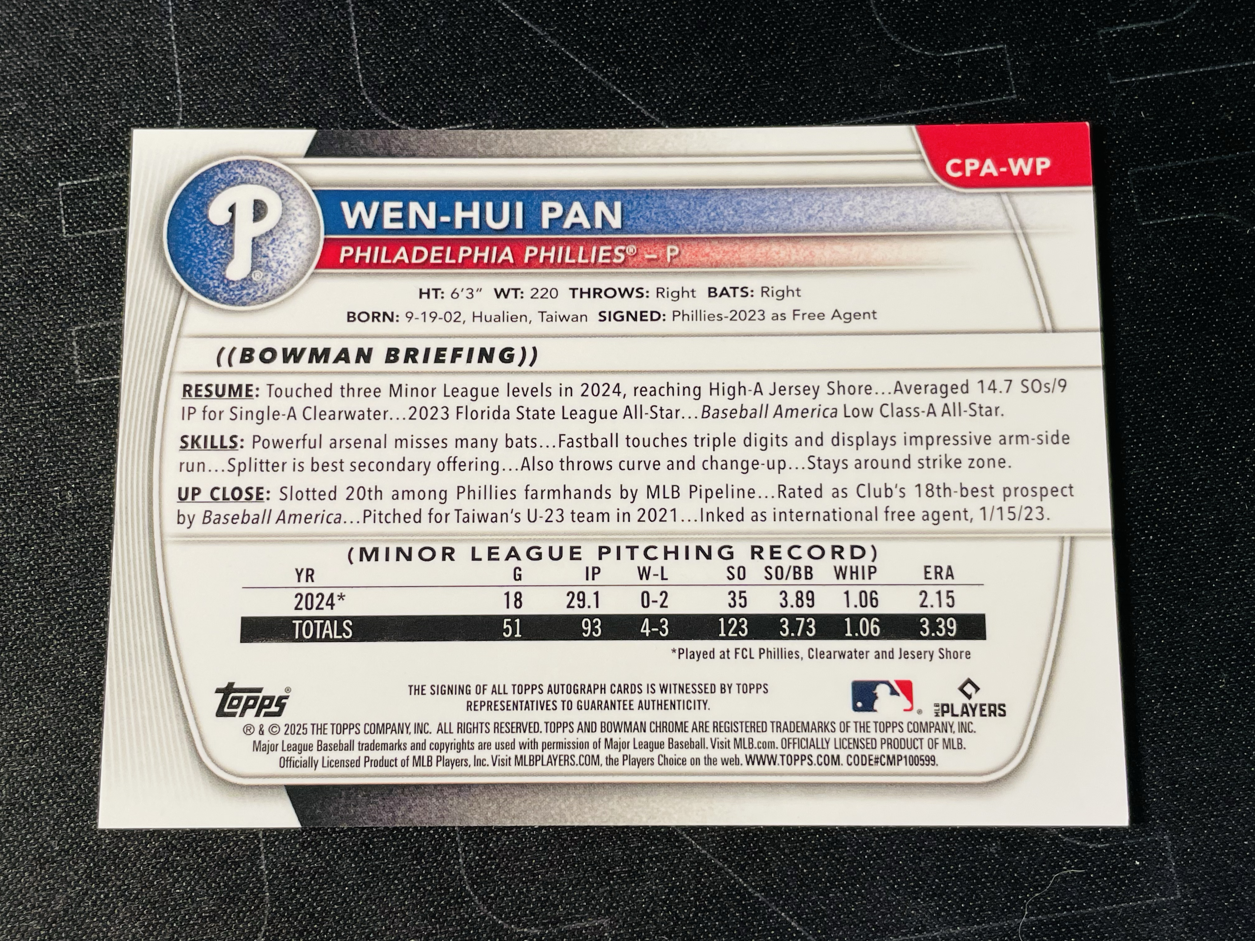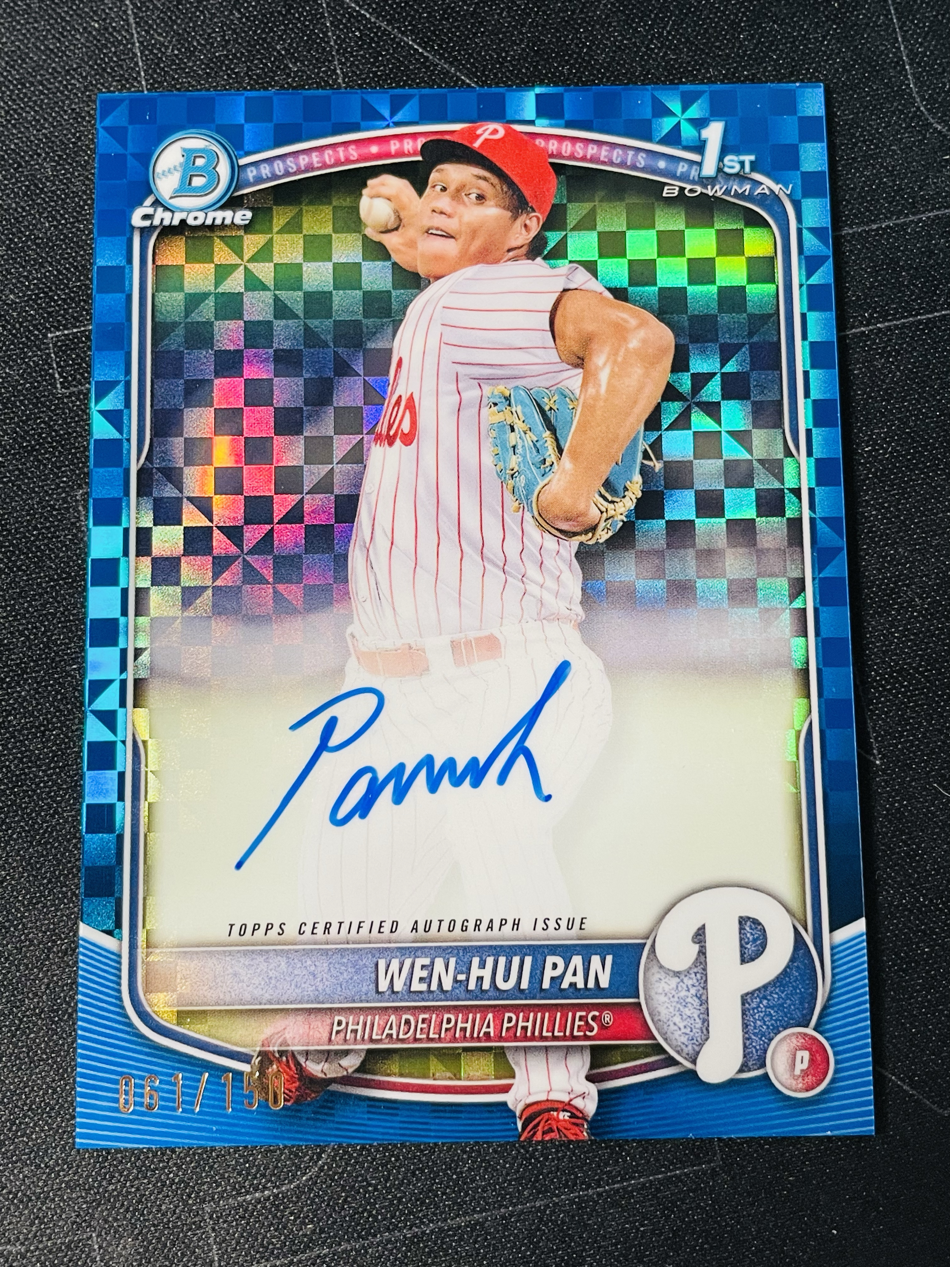 2024 Topps bowman chrome Wen Hui Pan RC 【MJ23棒球】美职棒MLB 1st新秀 潘文辉 卡签签字 费城人 150编蓝格子折射 卡品如图 好嗨