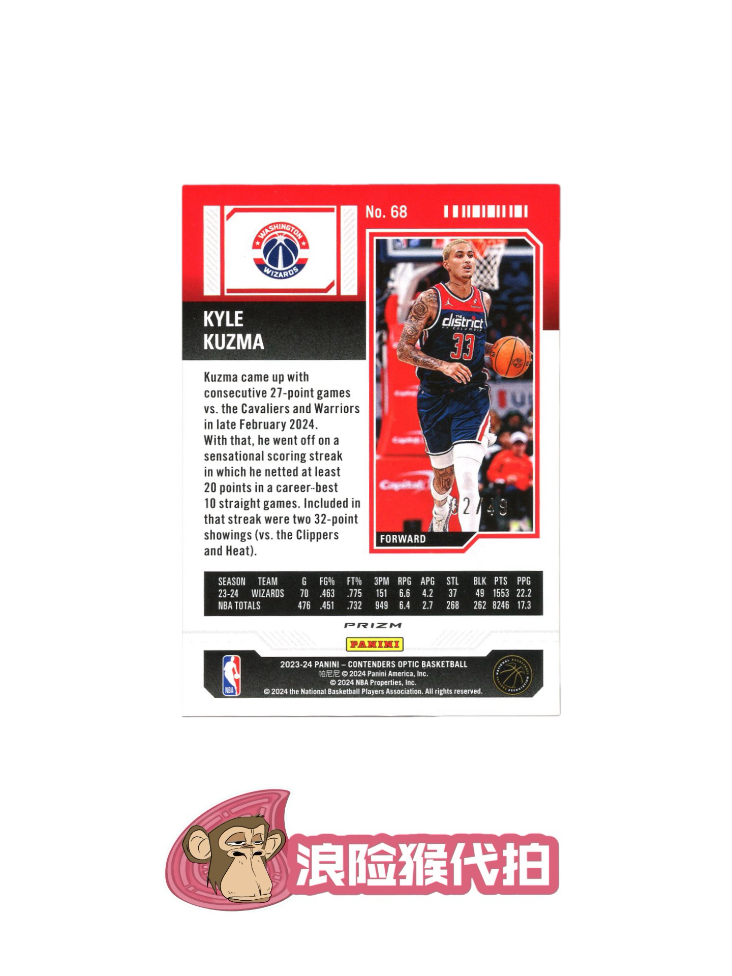 【浪险猴🐒代拍】2023-24 Panini Contenders Optic Kyle Kuzma 凯尔 库兹马 49编 橙折 湖人 奇才 球票OP 细节如图 黎明