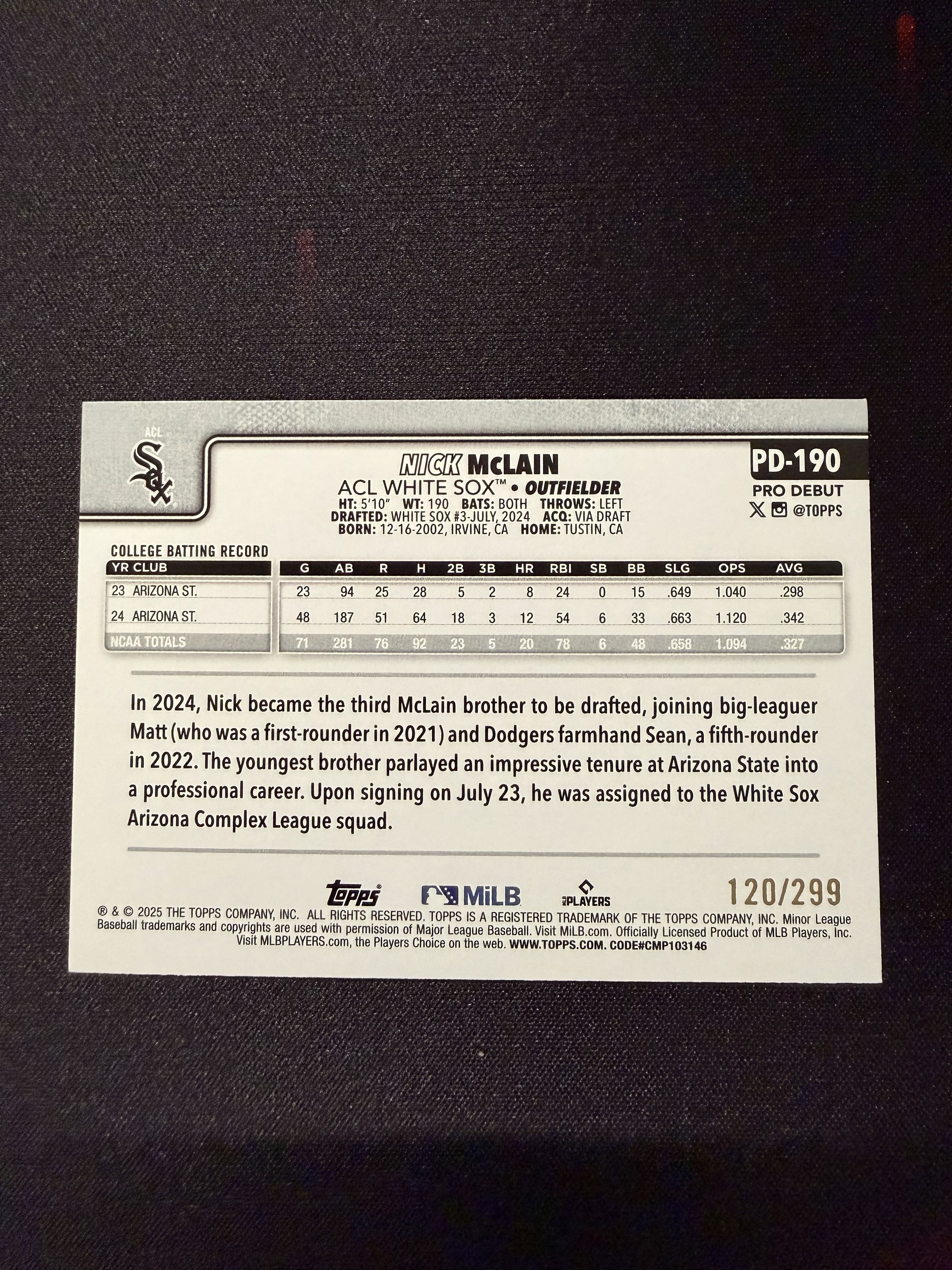 2025 Topps Pro Debut Nick Mclain RC 棒球 小联盟首秀系列 尼克 麦克莱 芝加哥白袜 外野手 紫折 120/299编
