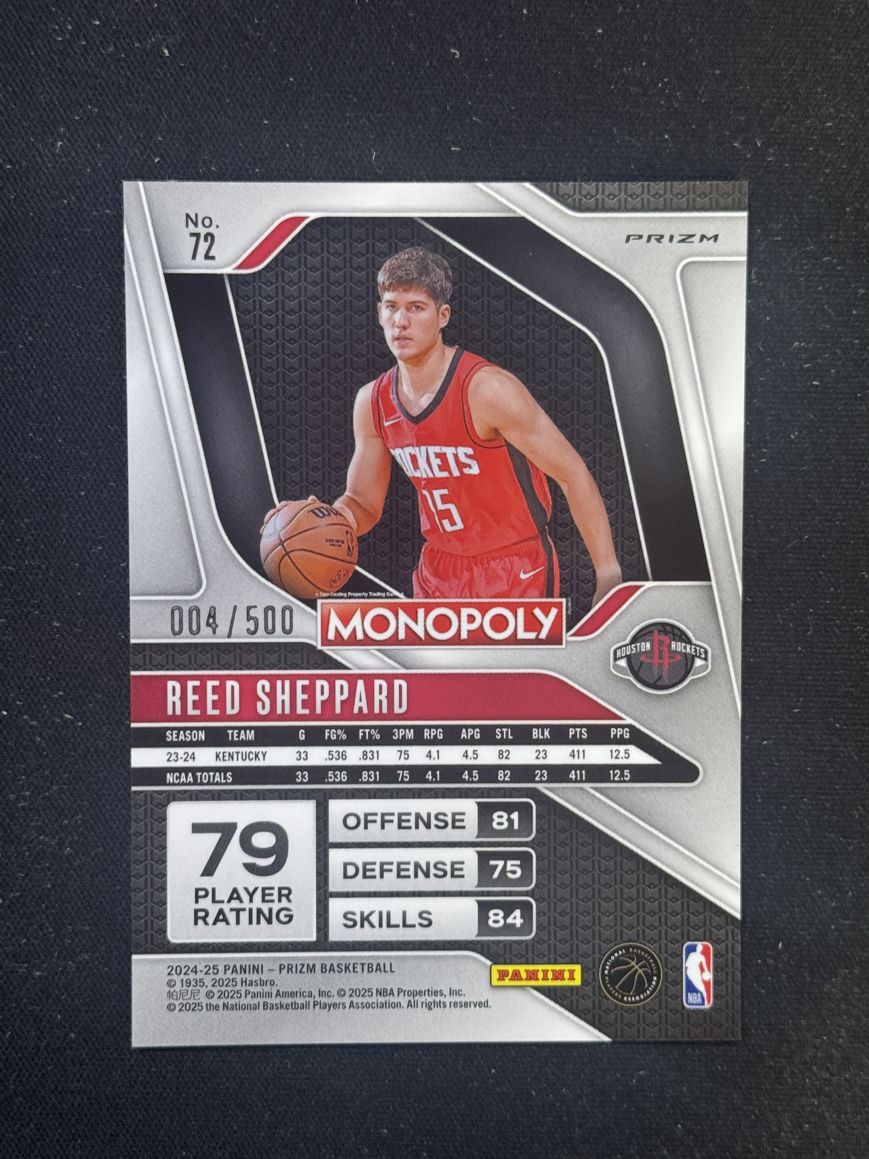 2024-25 Panini Prizm Reed Sheppard RC 【三三拍卖】PZ 大富翁 火箭 里德谢泼德 新秀RC 金shimmer 金money折 004/500编 退