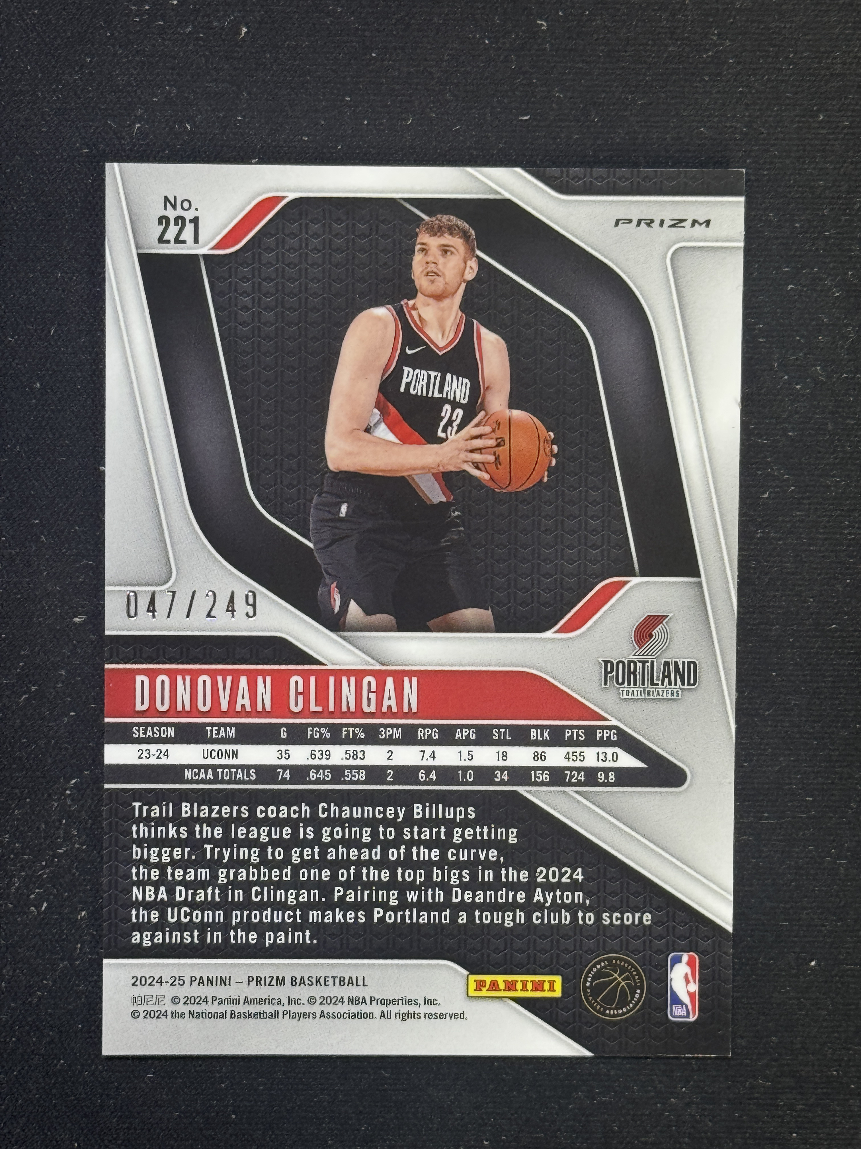 2024-25 Panini Prizm Donovan Clingan RC 【三三拍卖】 开拓者 多诺万 克林根 047/249编 新秀 银瀑布折 折射 退