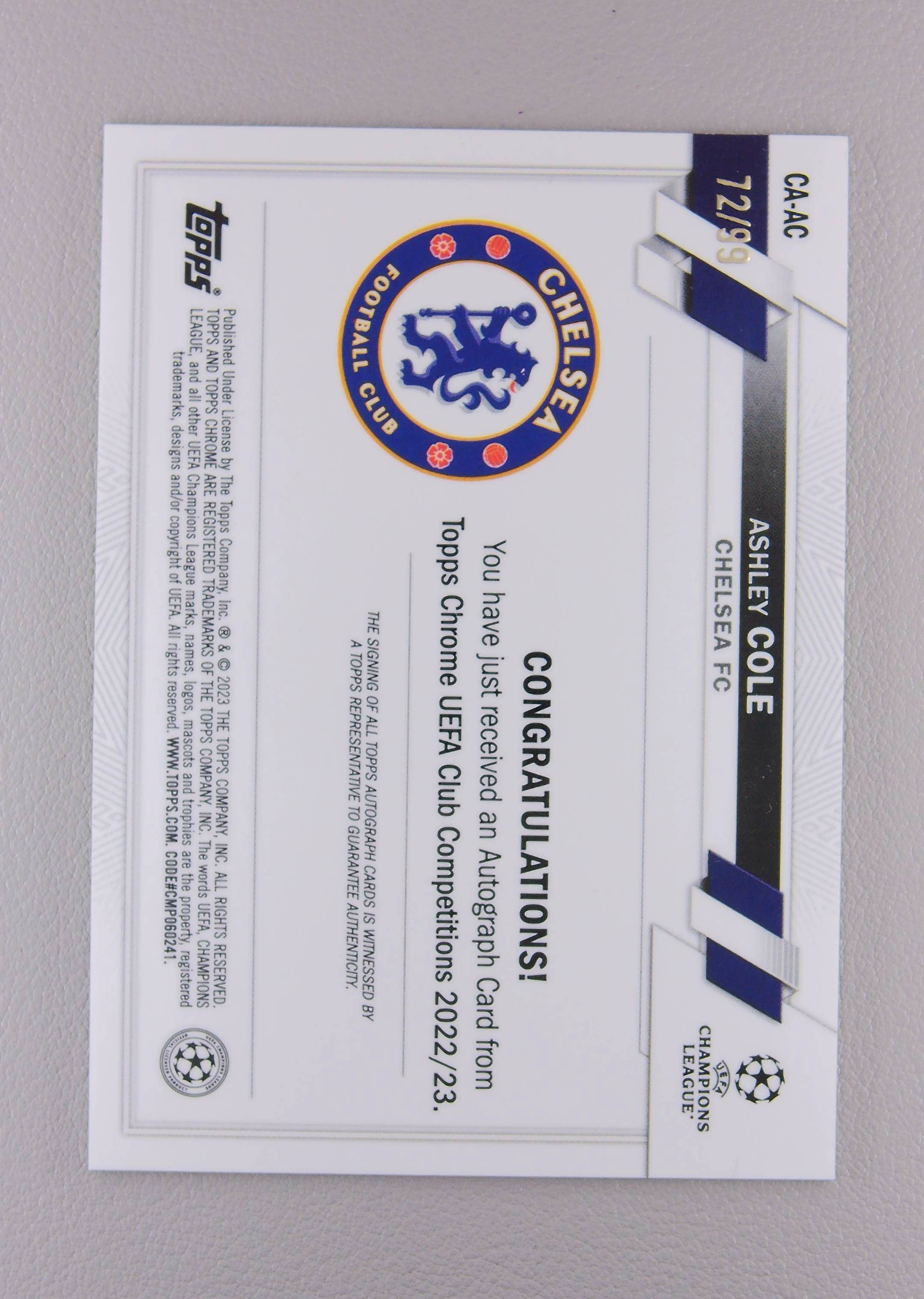战神无双拍卡 2023 Topps Chrome Ashley Cole 签字 阿什利 科尔 切尔西 99编 绿折 正TC (#豆芽)