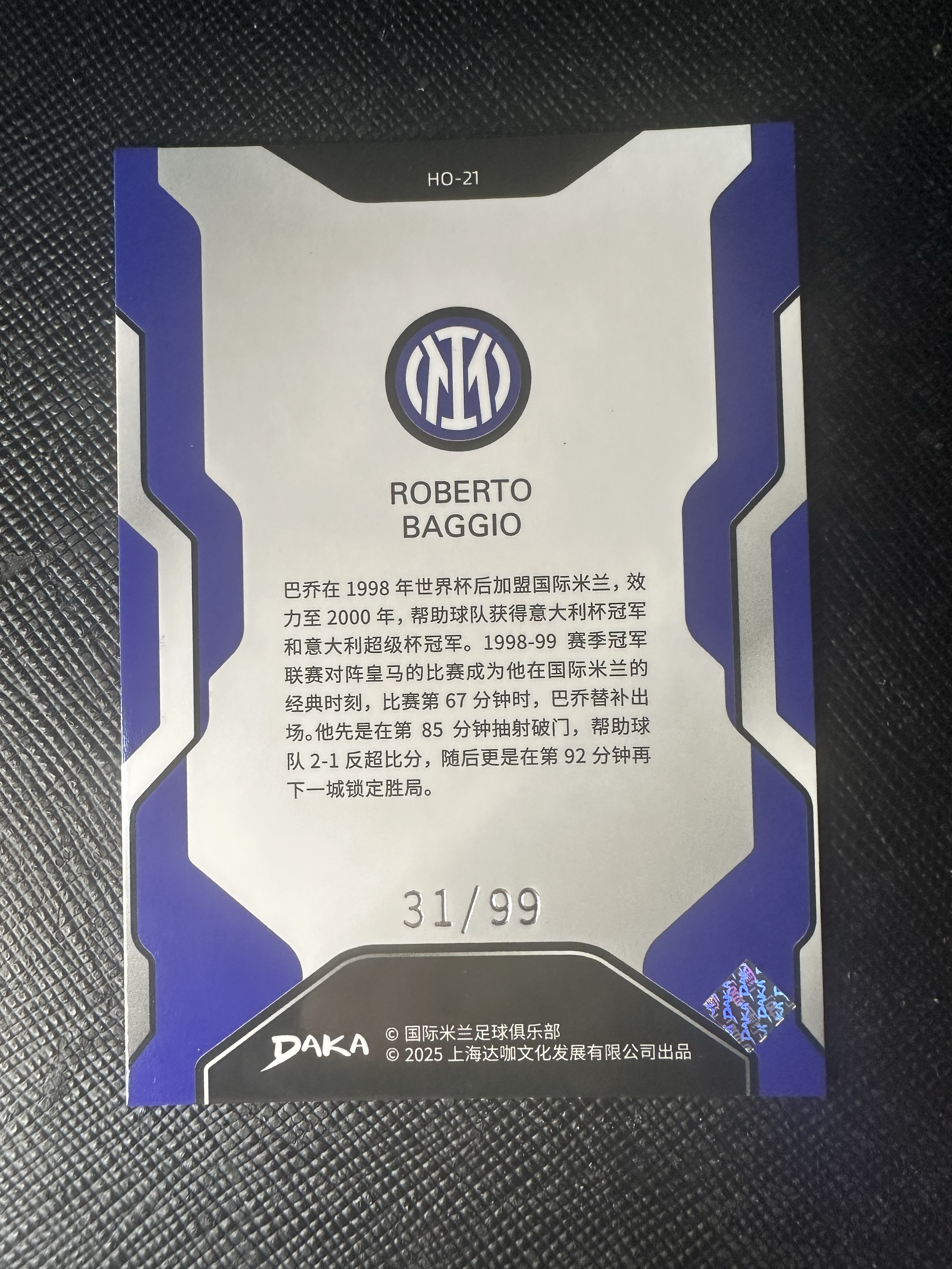 2025 DAKA 国际米兰俱乐部 Roberto Baggio 罗伯特 巴乔 国米 国际米兰 尤文图斯 AC米兰 意大利 忧郁王子 一代传奇 投资收藏必备 99编 31/99