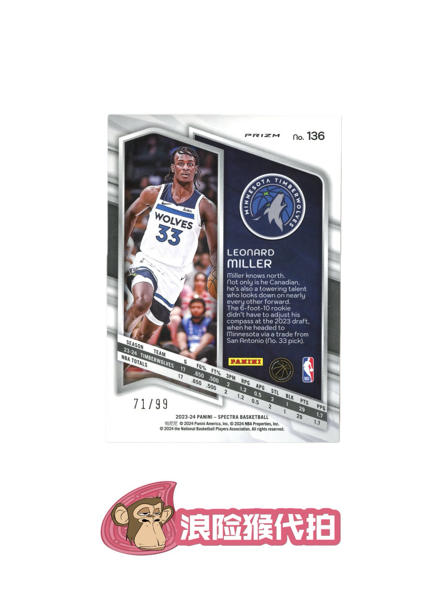 【浪险猴🐒代拍】2023-24 Panini Spectra Leonard Miller RC 99编 森林狼 伦纳德 米勒 潜力新星 新秀 光谱 折射 卡品如图 黎明