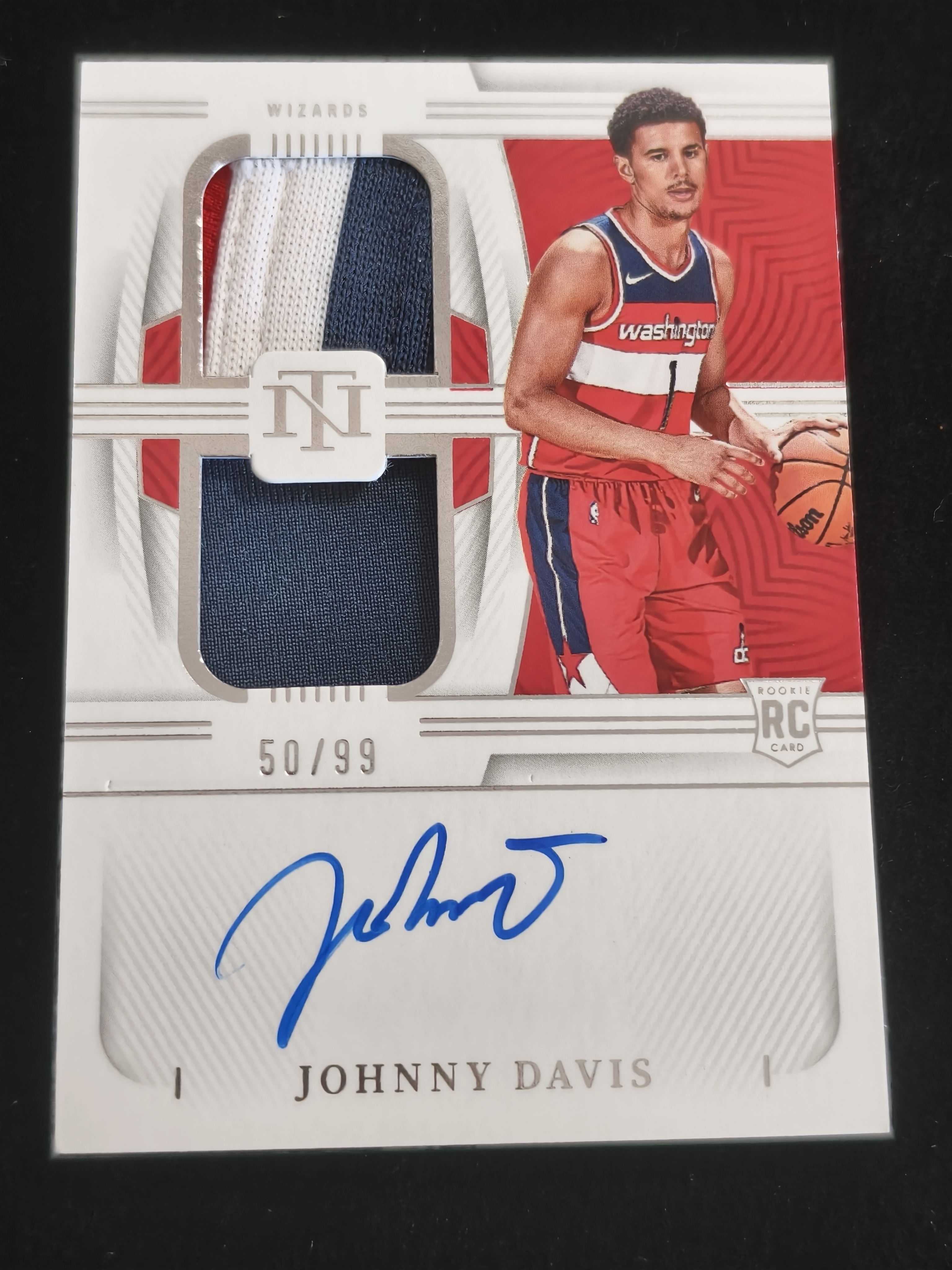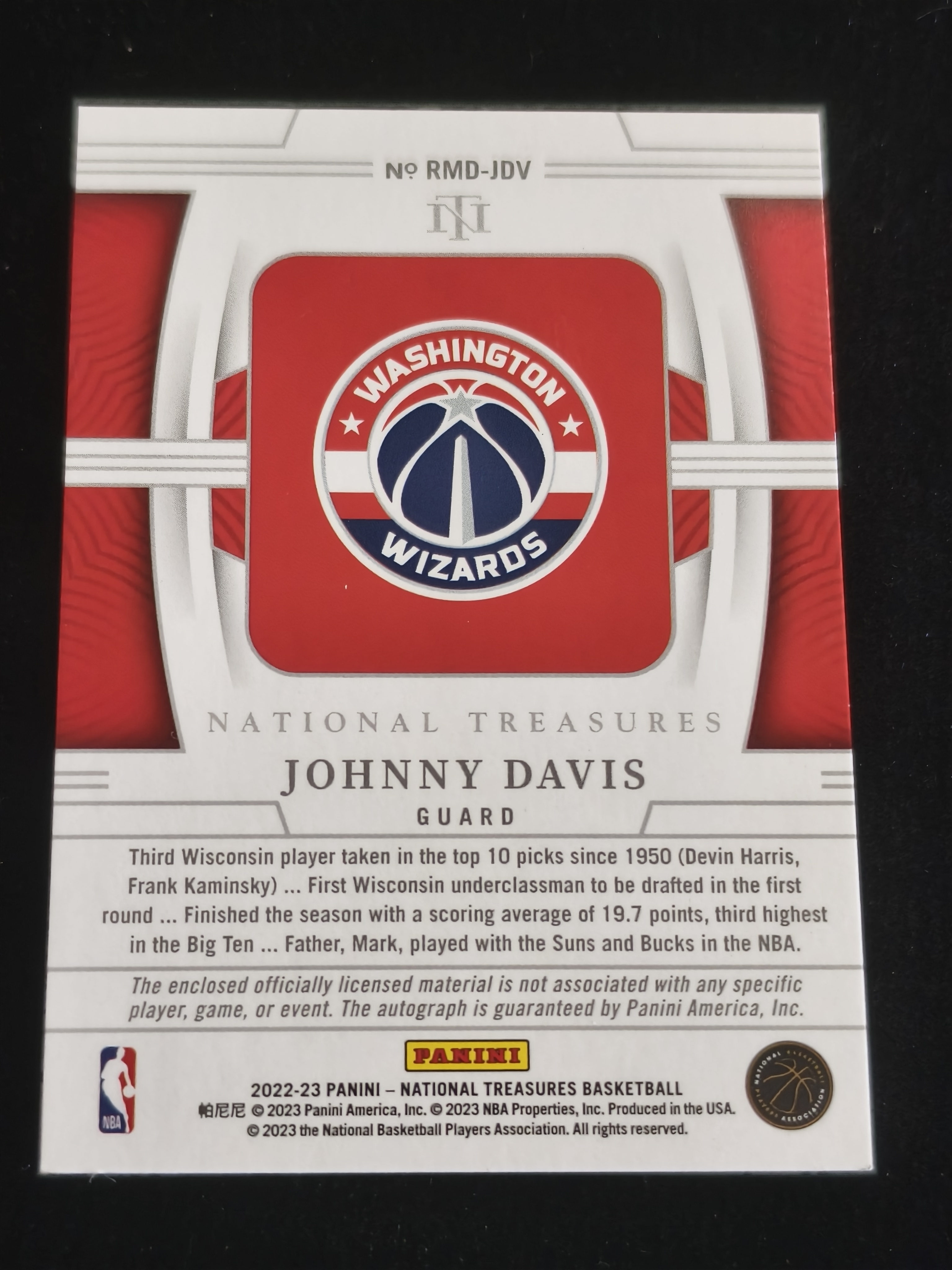 2022-23 Panini National Treasures Johnny Davis RC 国宝 奇才 约翰尼戴维斯 新秀 双窗球衣patch 签字卡签 50/99编 银平行 机长代拍 0251