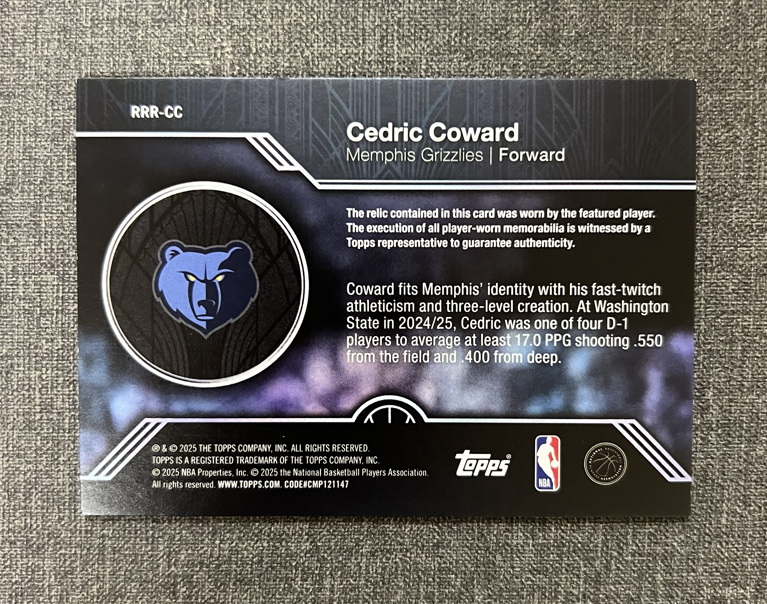 2025-26 Topps Flagship Cedric Coward RC 灰熊 新星 考沃德 新秀RC 大比例 折射 球衣 实物 物料 品相如图