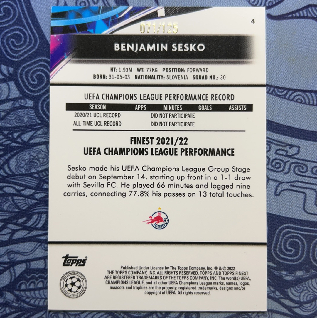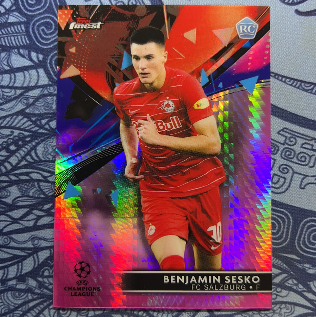 2022 Topps Finest Benjamin Sesko RC 欧冠 本杰明 塞斯科 谢什科 舍什科 萨尔茨红牛 曼联 新秀 粉脉冲折 125编 大热中锋 豪门猎物 卡品如图 顶级前锋状态火热