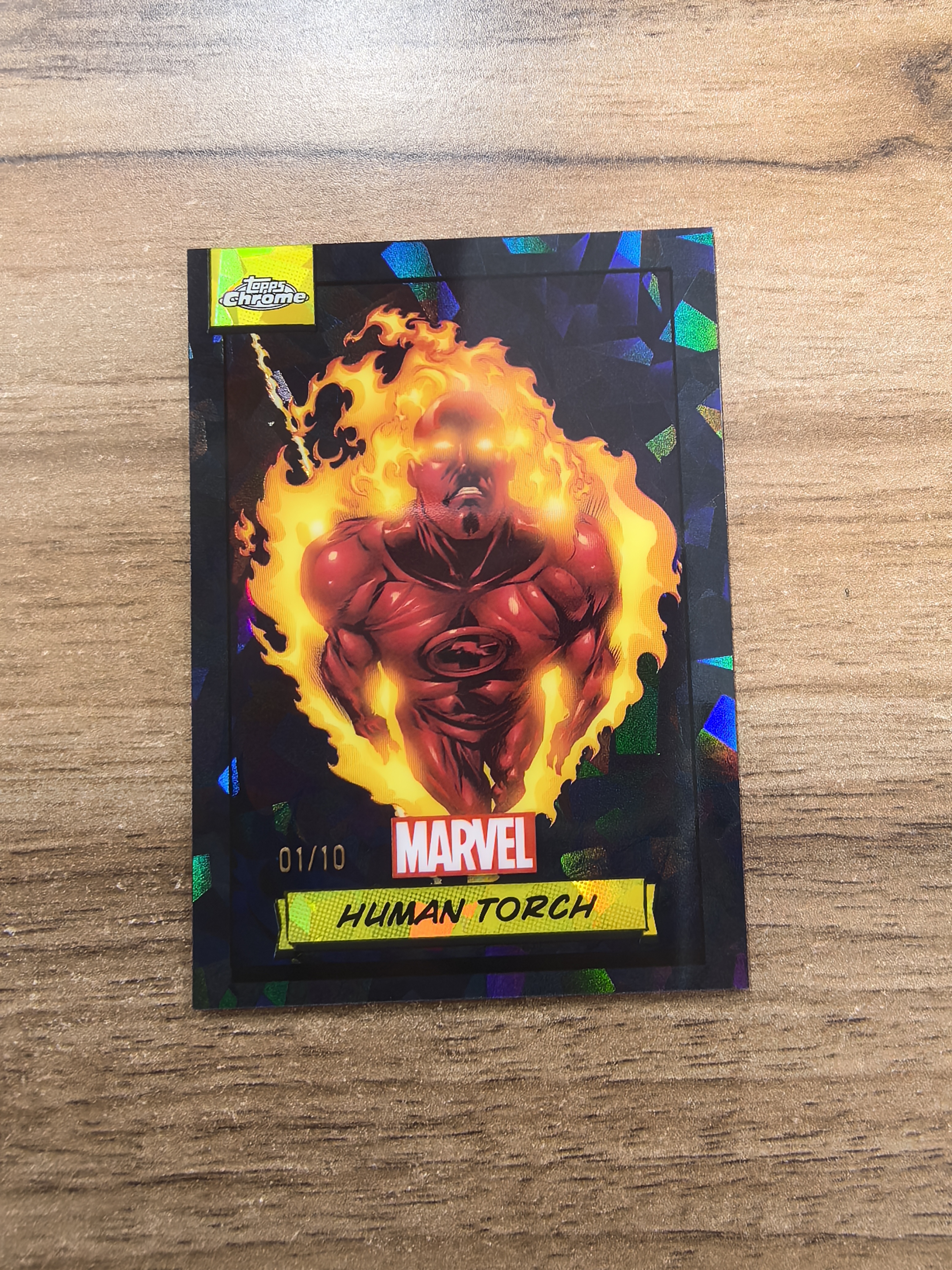 2025 Topps Chrome 漫威 HUMAN TORCH 霹雳火 01/10编 首编 碎冰折 折射 微瑕 实卡精美 卡品如图 收藏必入 流浪