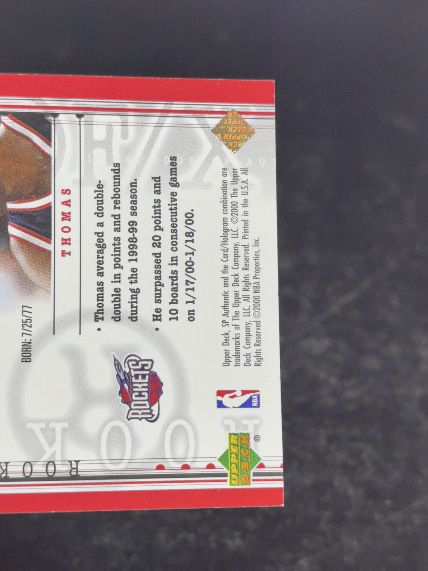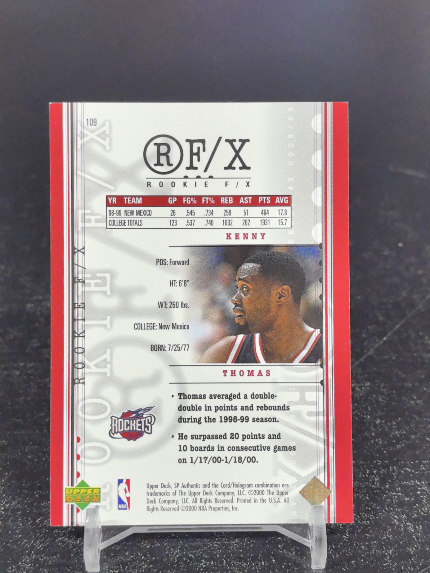 【浩行拍卖 截标预付82%】2000 Upper Deck sp authentic kenny thomas 火箭 肯尼 托马斯 新秀 rc 特卡 111/1500编 经典老卡 专收必备 瑕疵看图「途径」1123N02紋