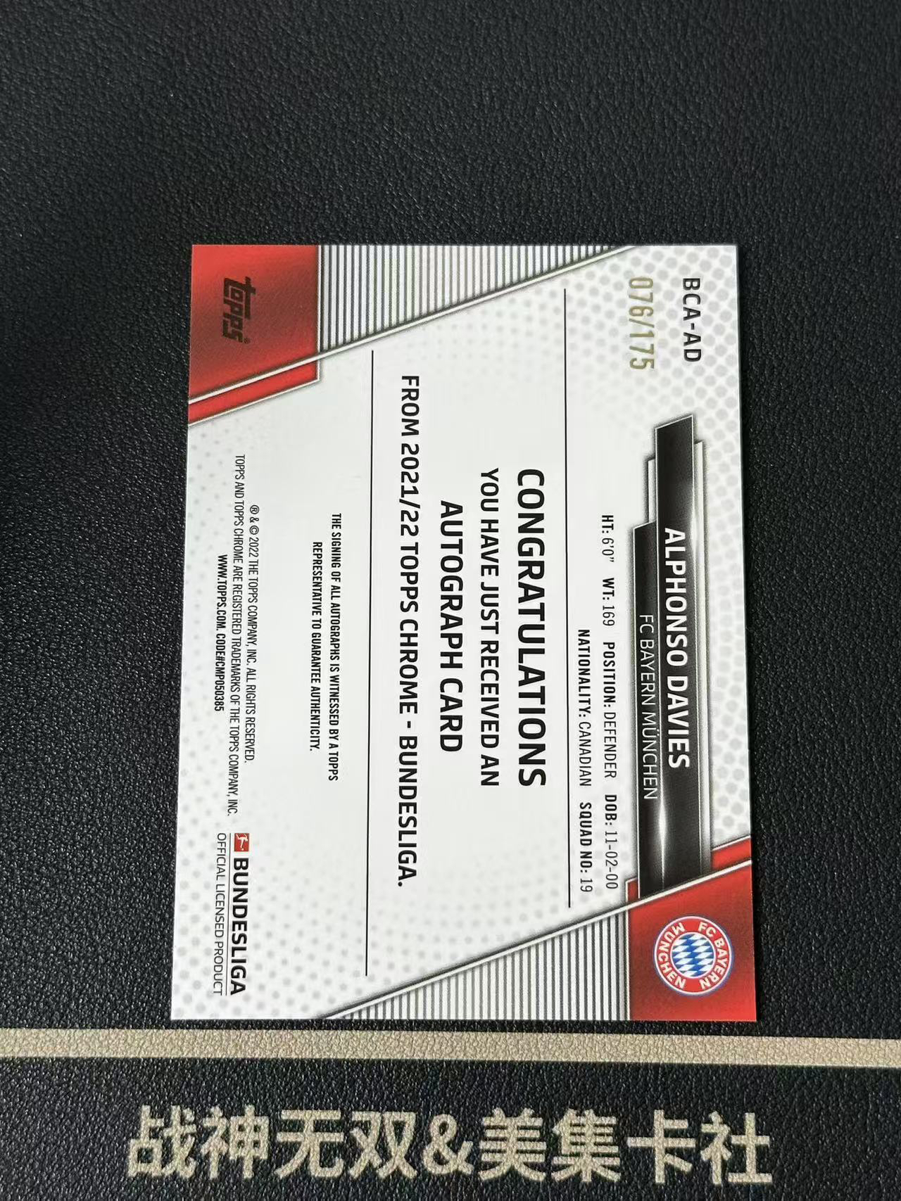 2022 topps Chrome alphonso davies 德甲 拜仁慕尼黑 阿方索 戴维斯 签字 175编 加拿大 战神(天空之城)