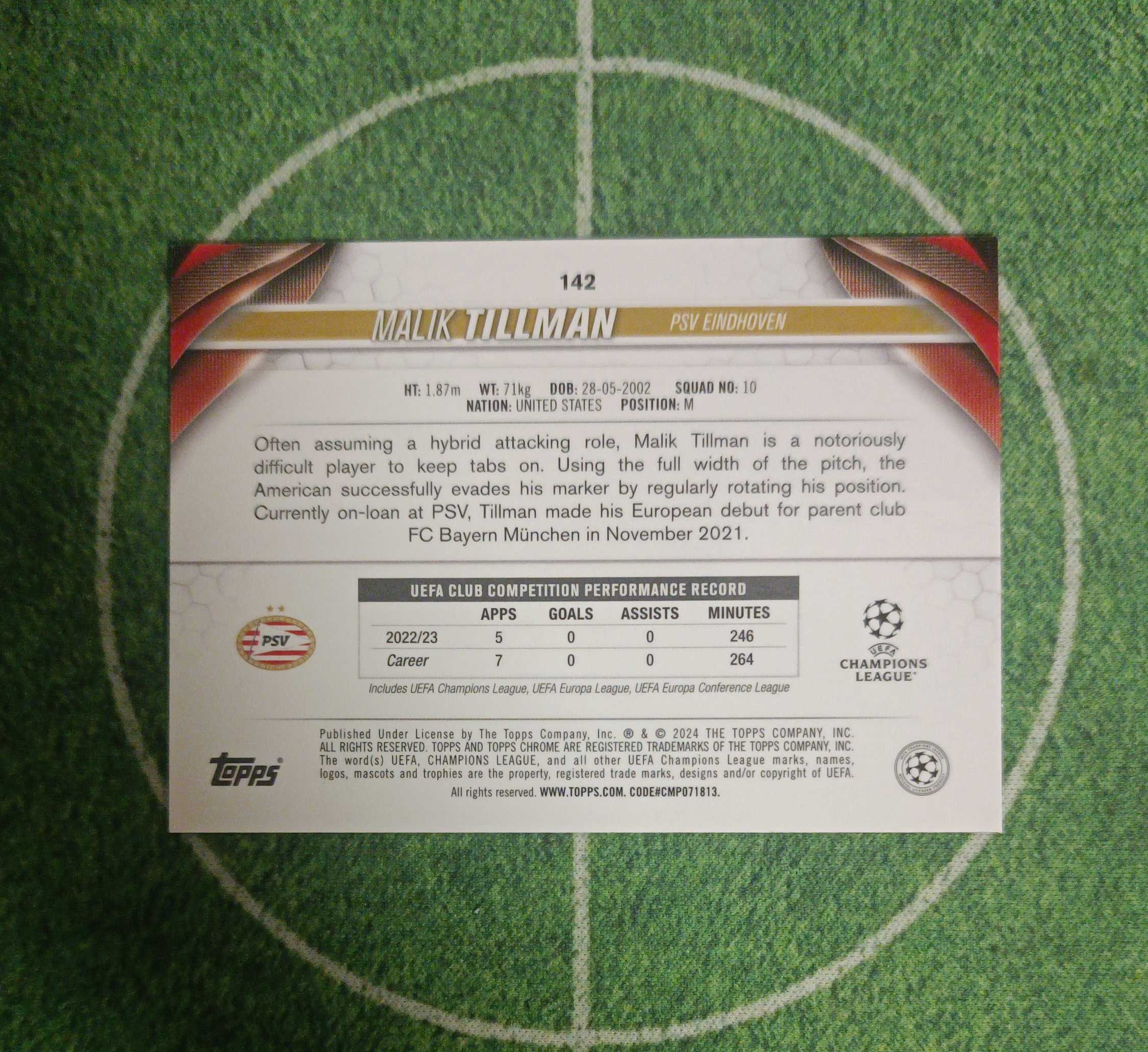 2024 Topps Chrome Malik Tillman 欧冠 埃因霍温 蒂尔曼 150编 豪门猎物 卡品如图