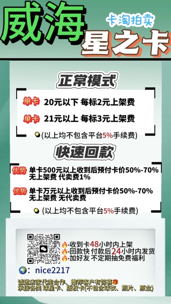 付款:竞拍成功后请于【卡淘新规3天内付款】,超过3天不付款不回信必投诉封号!买卡皆为自愿出价,拒绝使用拍错等理由!竞拍成功后不接受任何理由的弃标和发布点赔偿!所有拍品不支持直接上拍等其他后续服务。