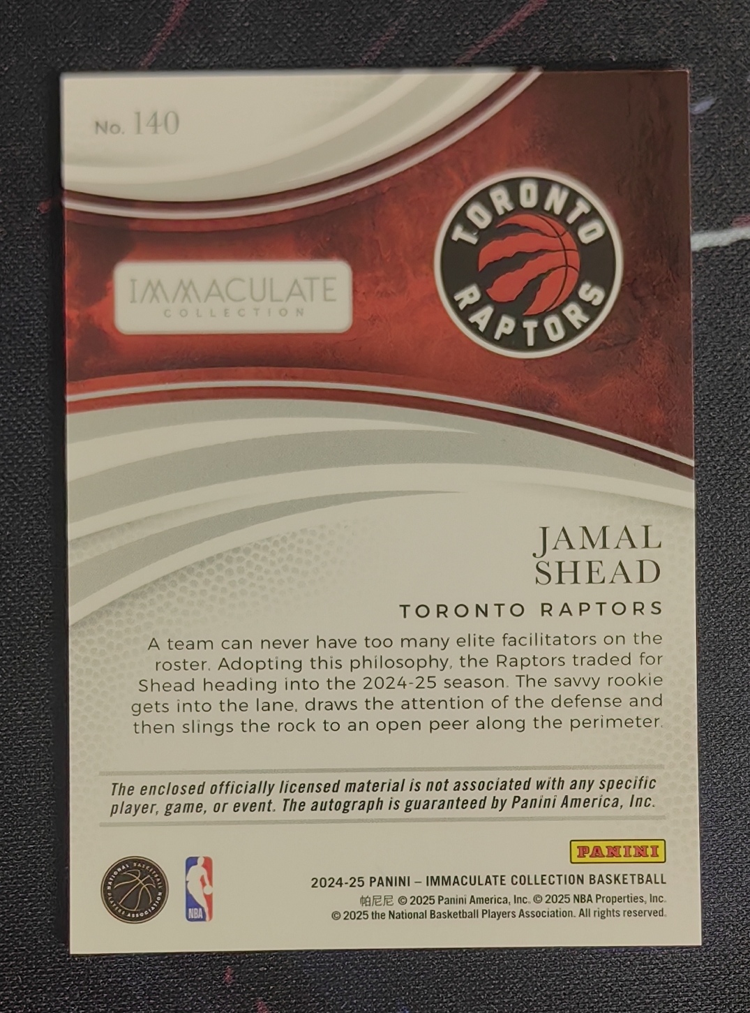 2024-25 Panini Immaculate Mal Shead RC 猛龙 新秀RC 谢德 爱咪咪签字卡签 99编 三色球衣物料切割RPA 潜力好秀(爱妈拍卖)可累计 免费代拍 瑕疵看图