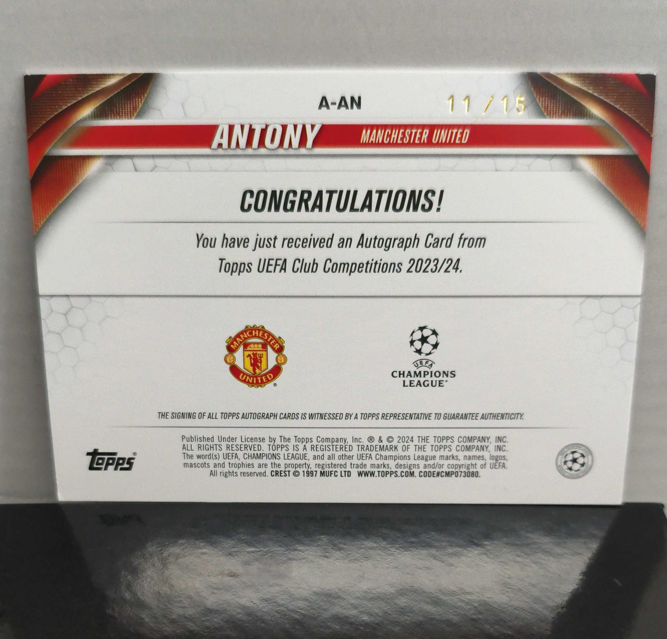 2023-24 TOPPS UEFA CHAMPIONS LEAGUE ANTONY 欧冠 曼联 安东尼 紫熔岩 11/15编 签字