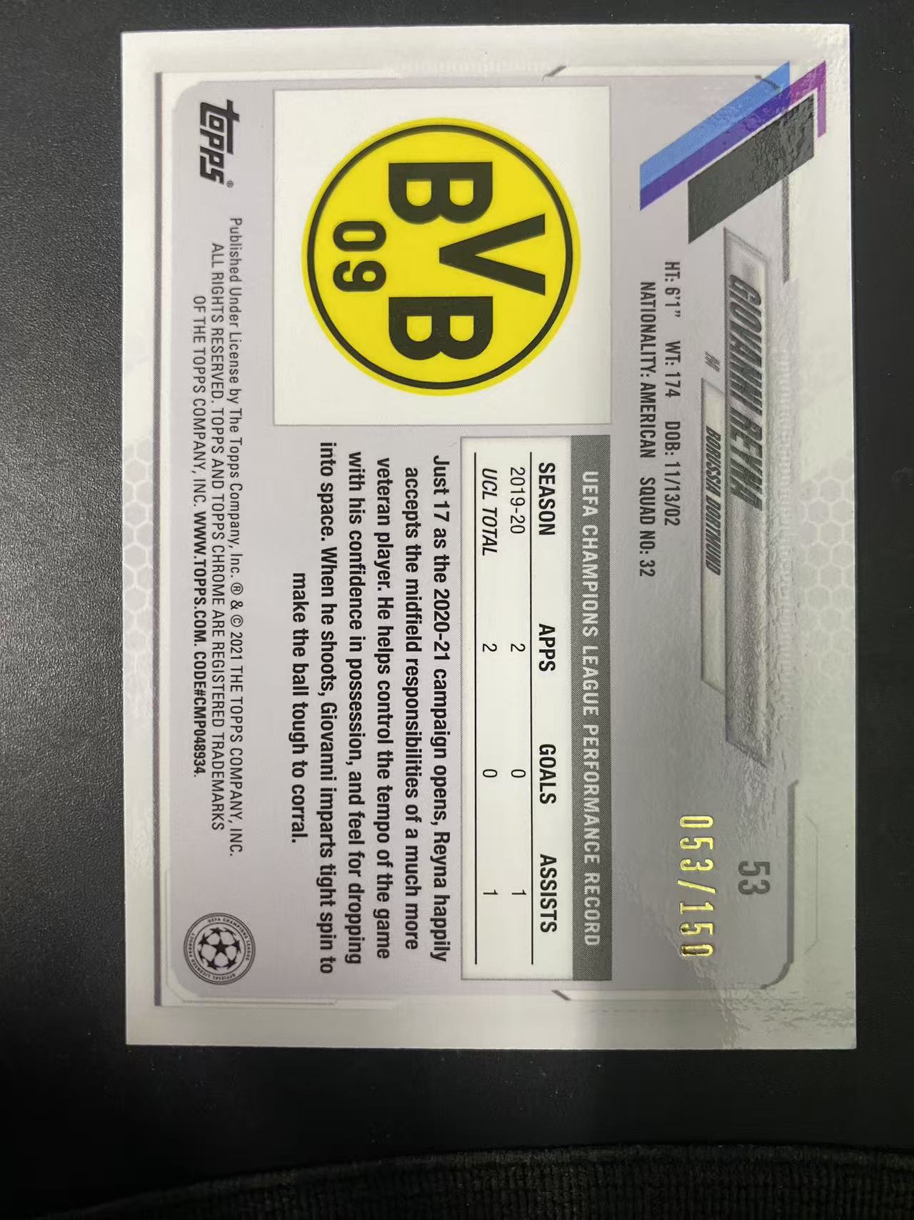 2021 Topps Chrome GIOVANNI REYNA 欧冠TC 吉奥瓦尼 雷纳 多特蒙德 青折 53/150编 折射 卡品如图 微瑕 睡总