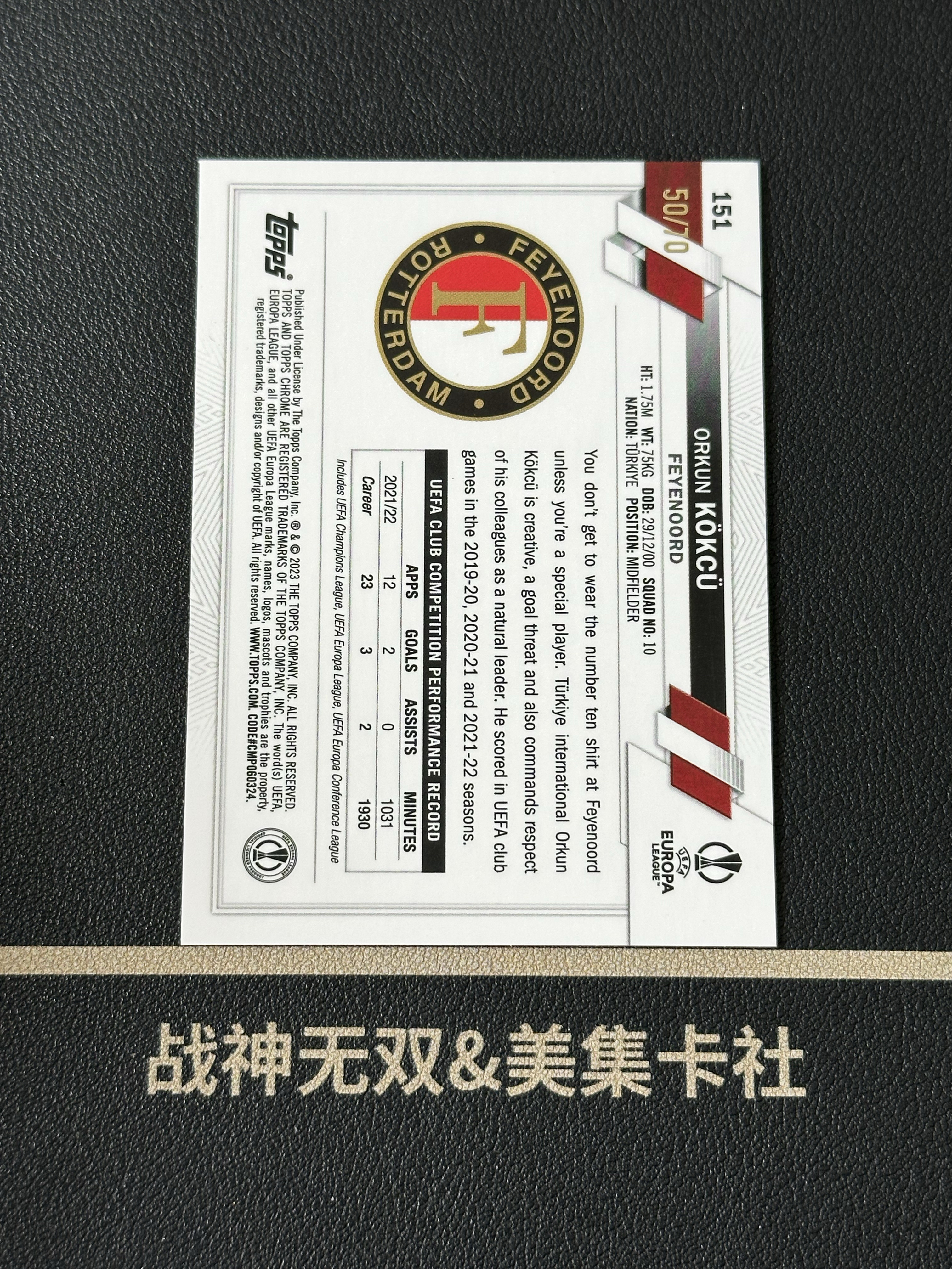2023 Topps Chrome ORKUN KOKCU 费耶诺德 新秀RC 奥尔昆 柯克曲 欧冠 蓝宝石 70编 战神无双(东)
