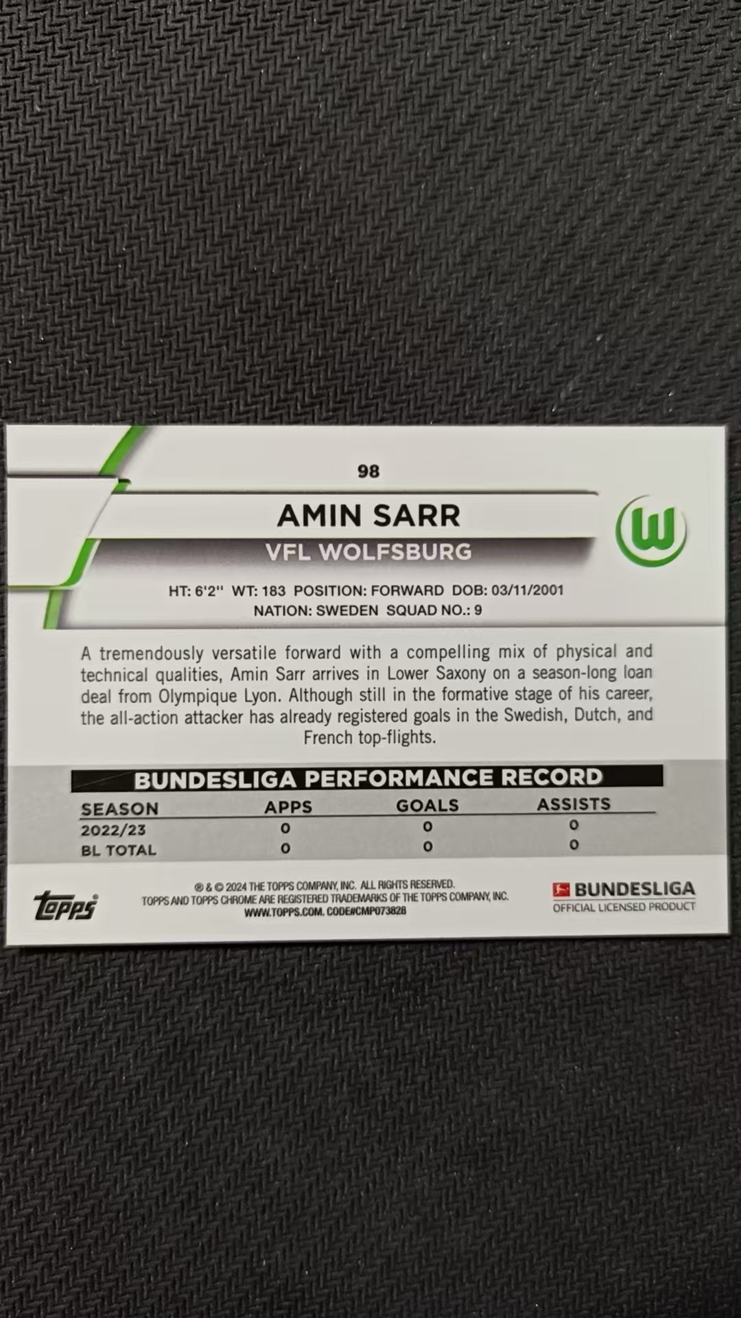 萨尔 沃尔夫斯堡 德甲 tc蓝宝石 黄碎冰折 50编 RC 新秀 hx