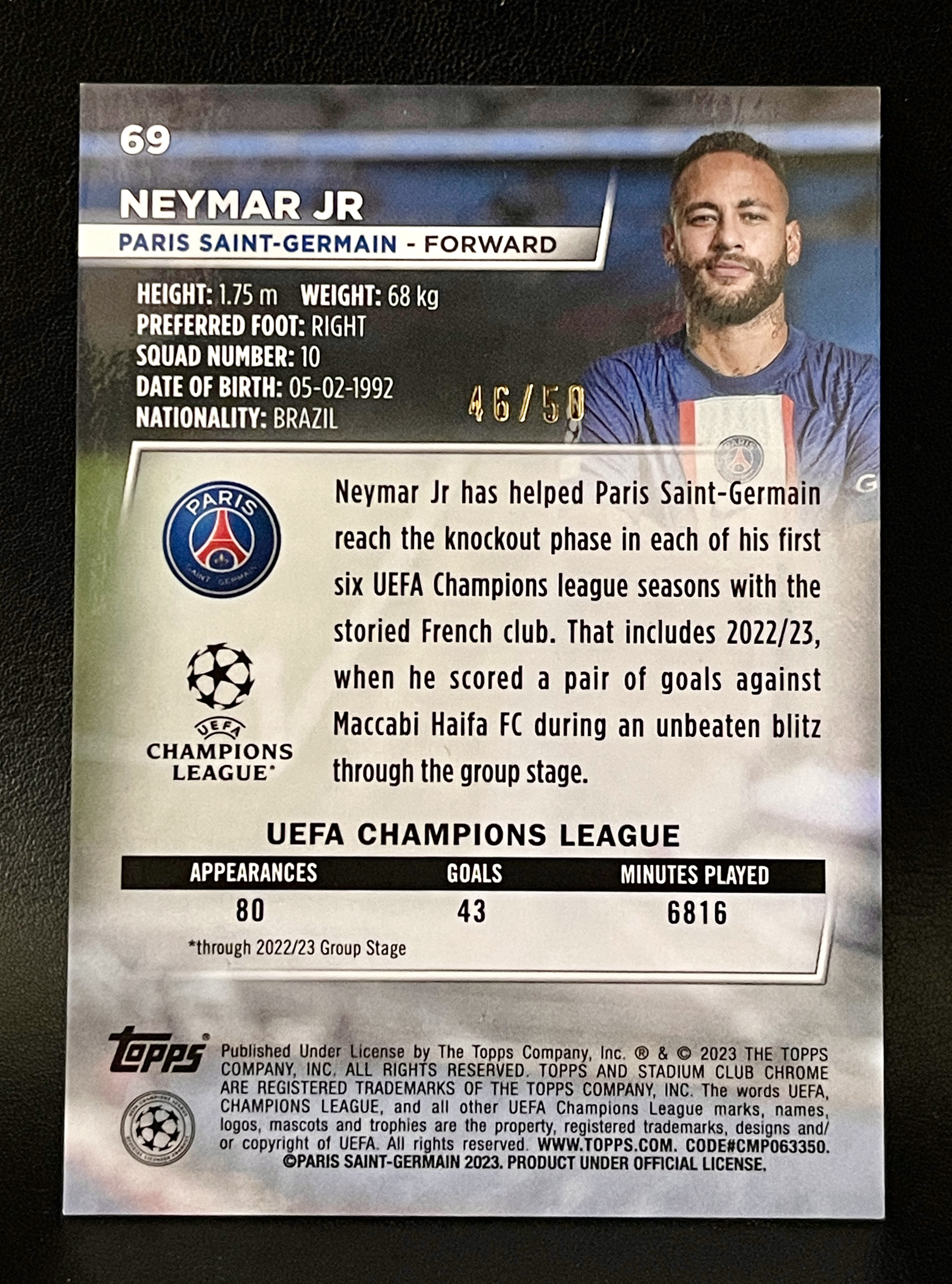 内马尔 内少 2023 Topps Stadium Club Chrome 欧冠竞技场 46/50编 金折 折射非常漂亮 巴黎 巴萨 巴西天王 最后的桑巴舞者