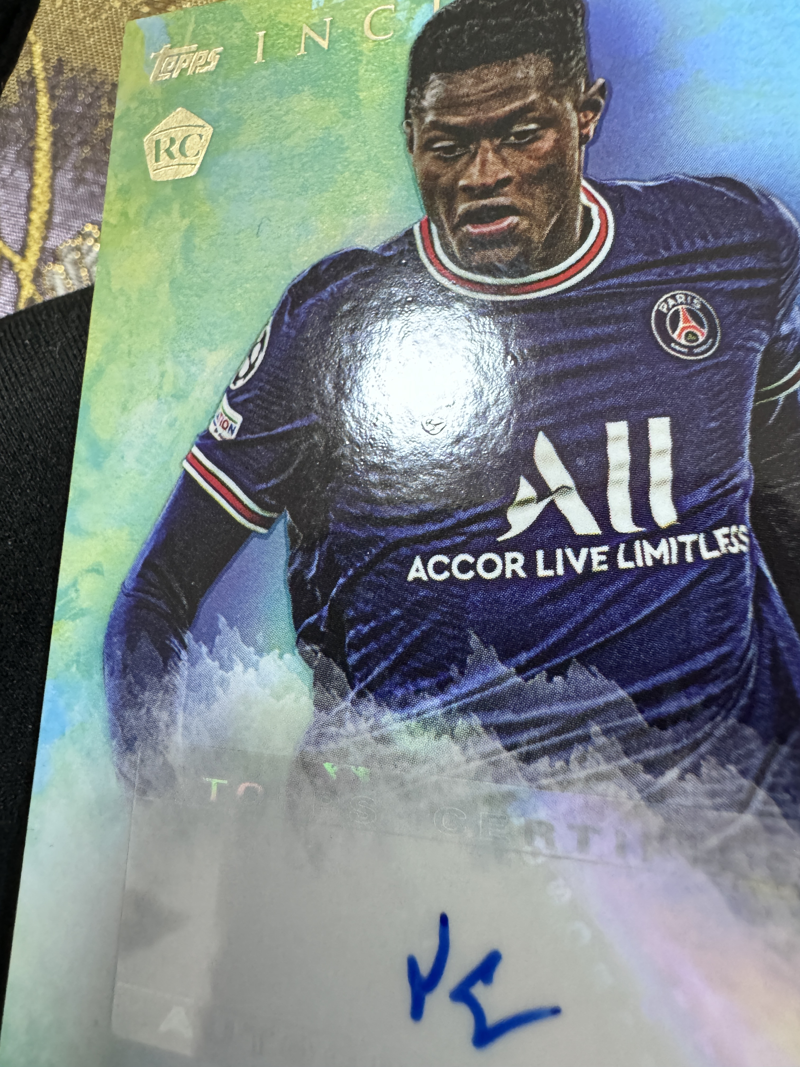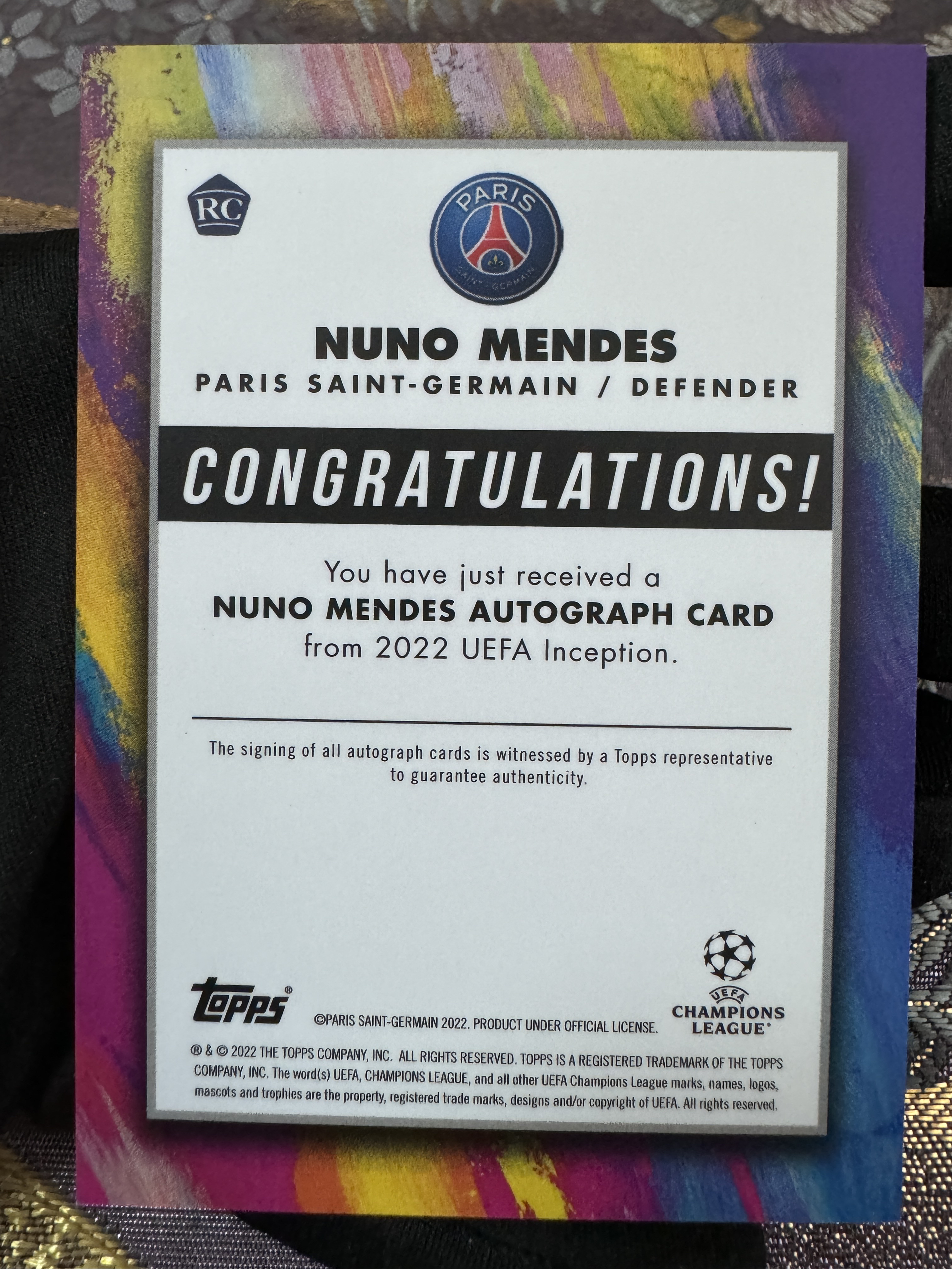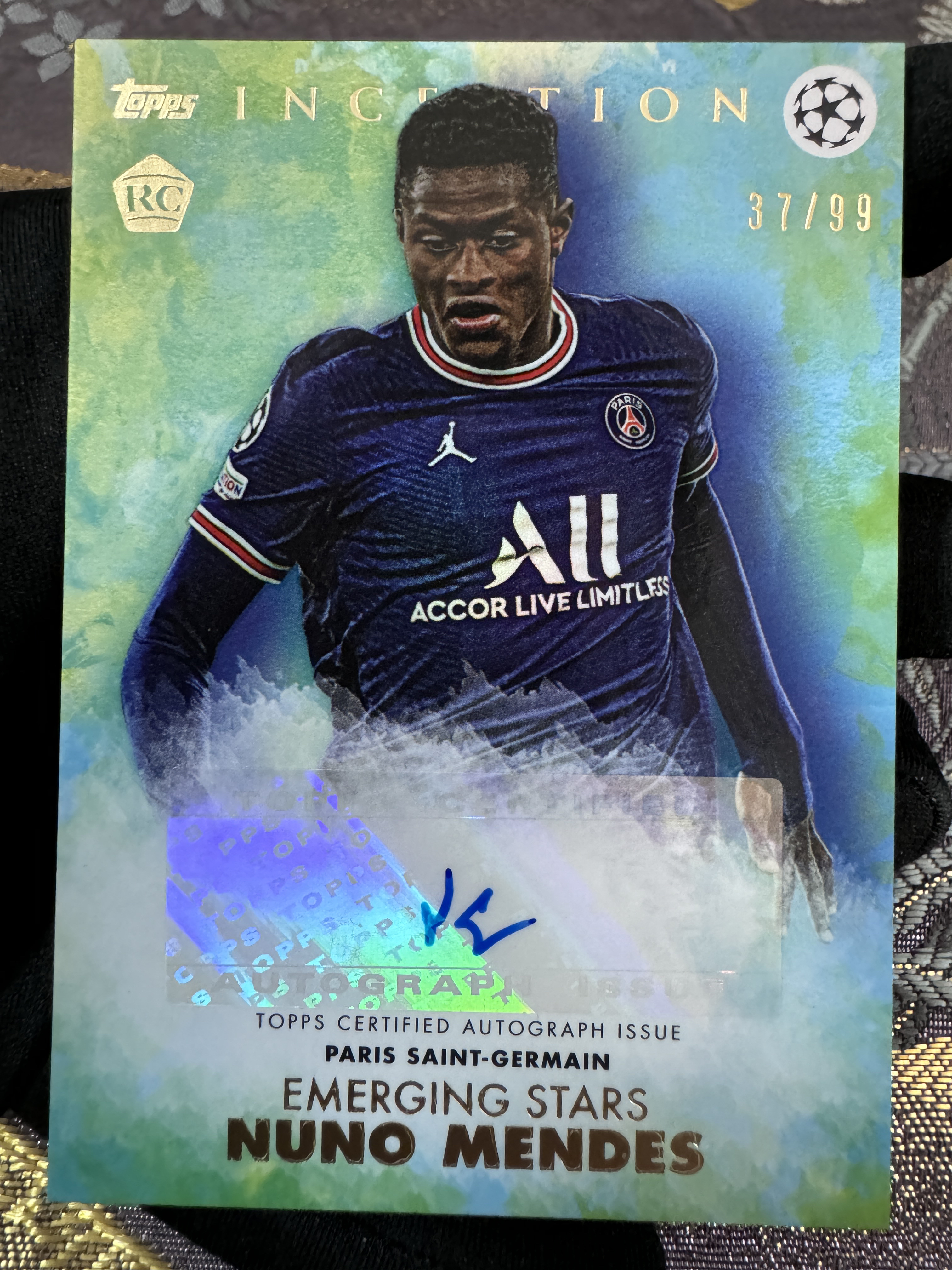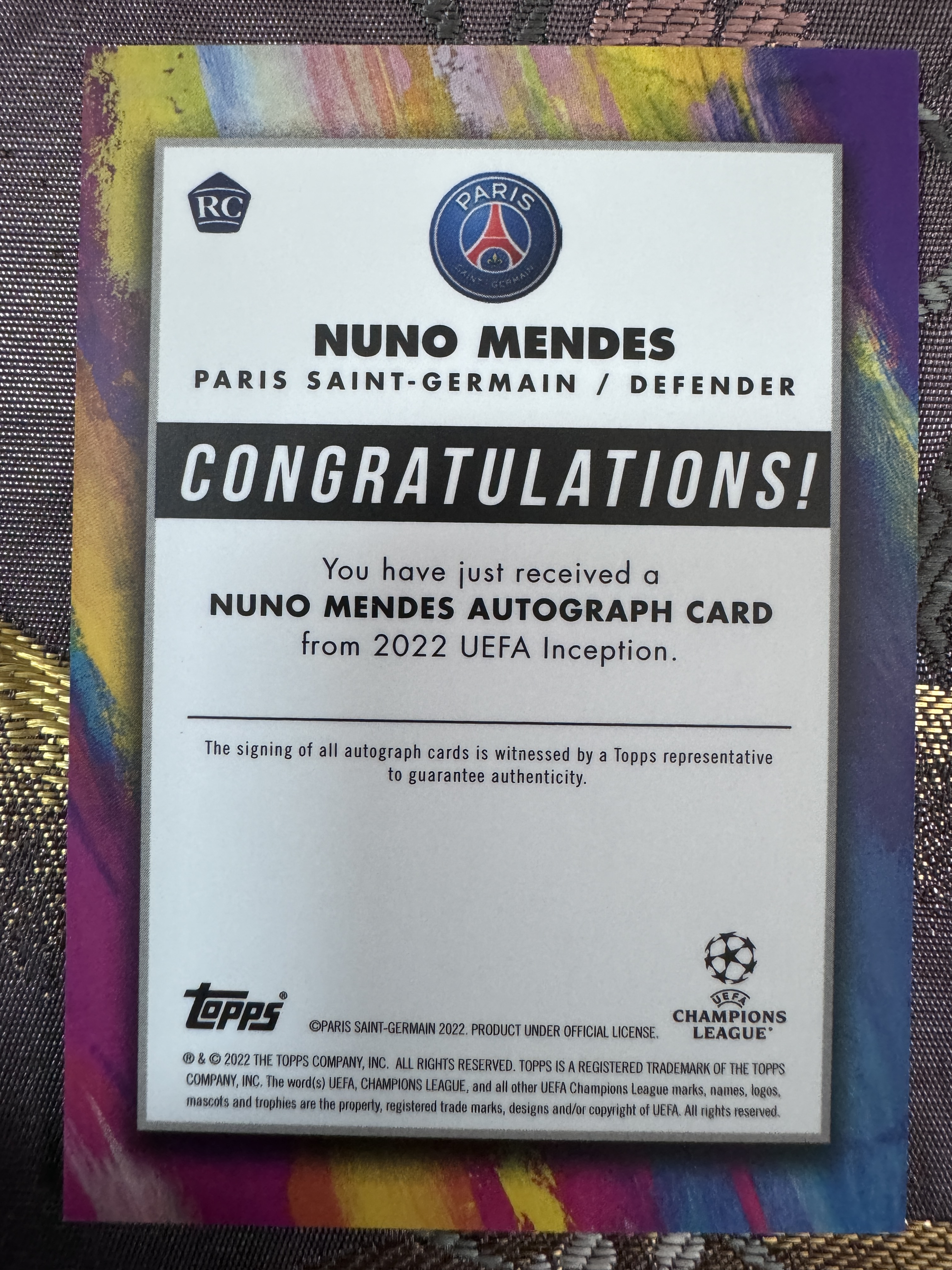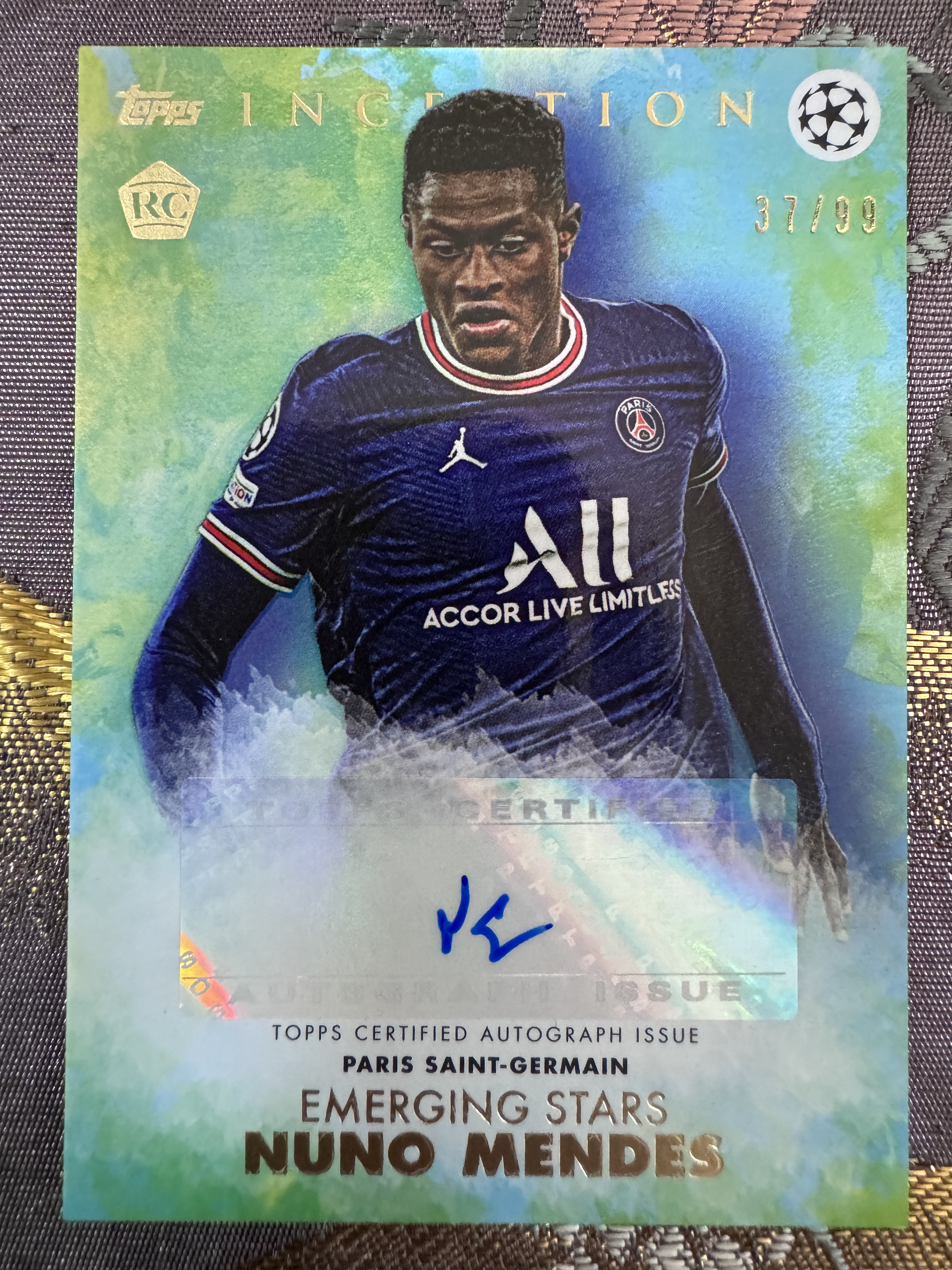2022 Topps Inception Nuno Mendes 欧冠 盗梦空间 大巴黎 葡萄牙 超级巨星 努诺 门德斯 新秀正RC标 投资大热 绿油画 泼墨签 37/99编 签字 完美墨迹 实卡精美