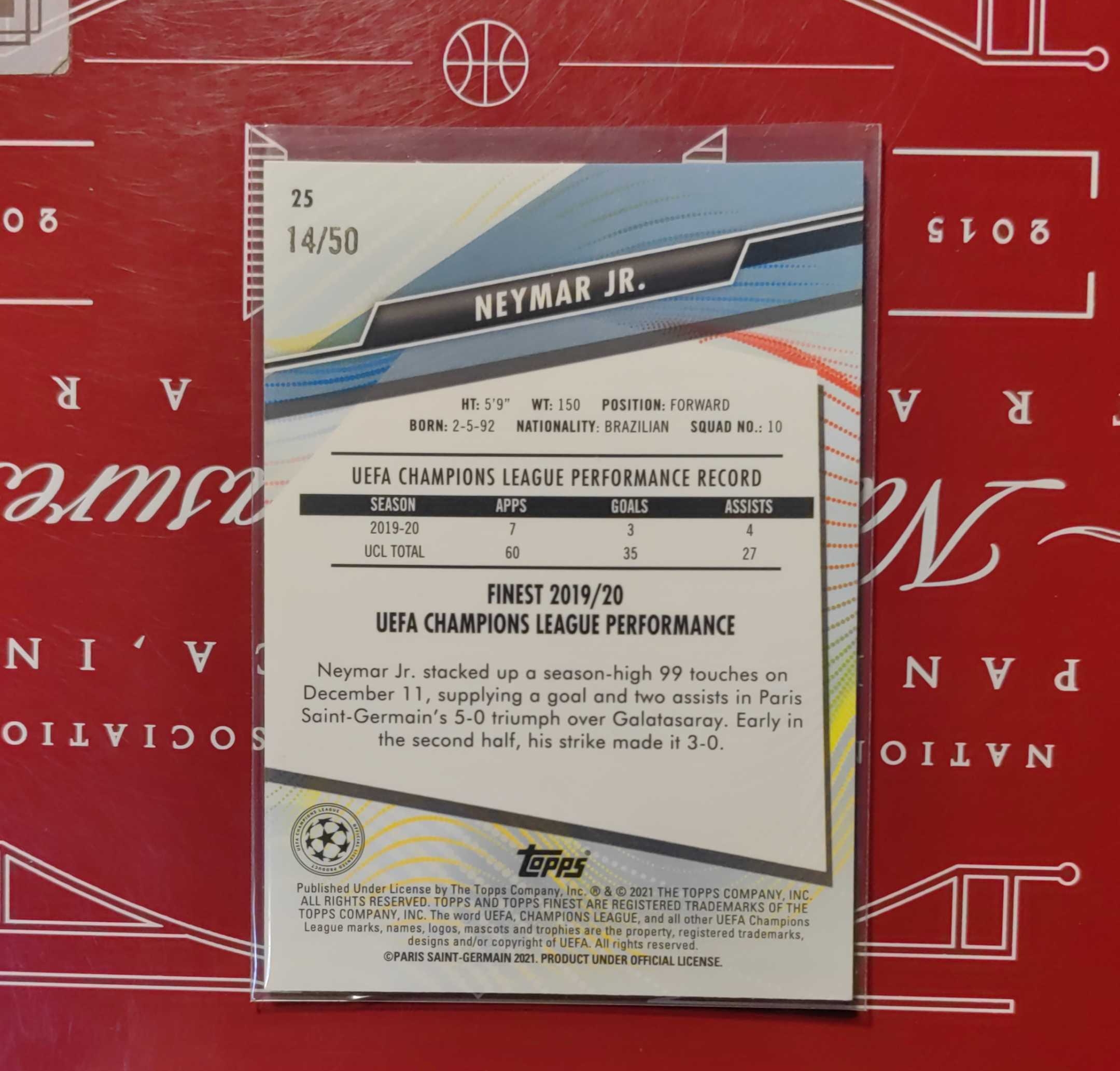 2021 Topps Finest Neymar Jr. 内马尔 14/50编金折 特卡 巴西队 巴黎圣日耳曼 巴塞罗那 梅西姆巴佩队友 世界杯冠军
