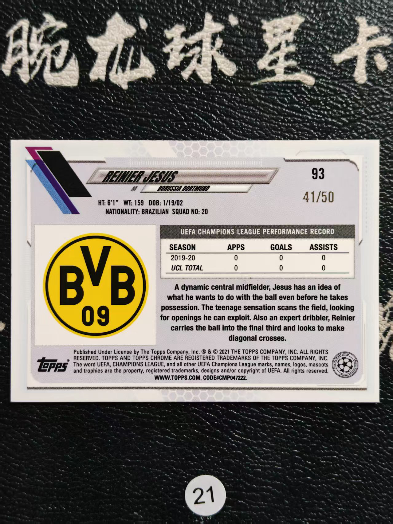 2021 【腕龙拍卖 接代卖】 腕龙桐哥AV7 Topps Chrome 欧冠 蓝宝石 雷尼尔 热苏斯 多特蒙德 RC新秀 橙碎冰折 41/50编 Reinier Jesus 卡品如图 收藏必备