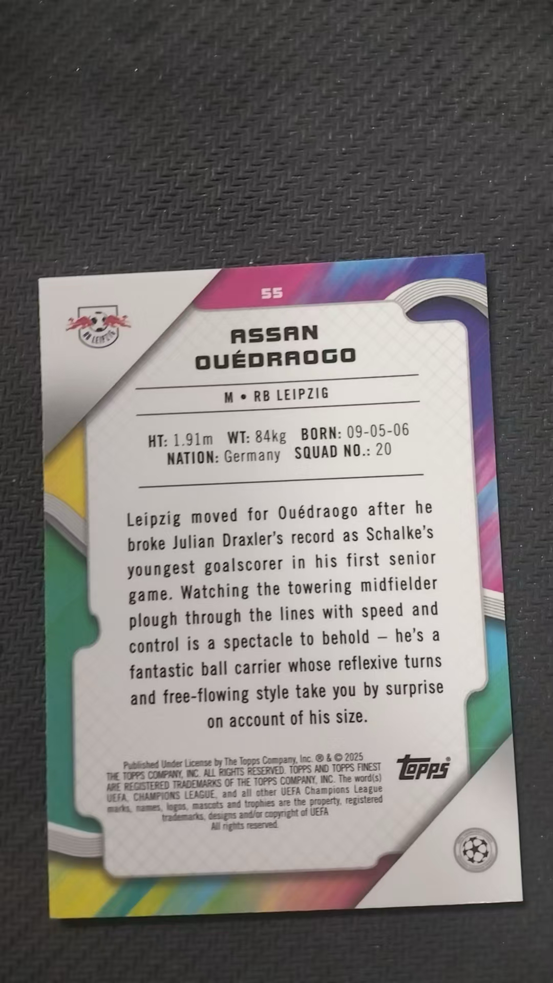 2025 topps finest 欧冠 ouedraogo 莱比锡红牛 新秀 韦德拉奥果 大妖 RC新秀 99编 绿熔岩折 法师