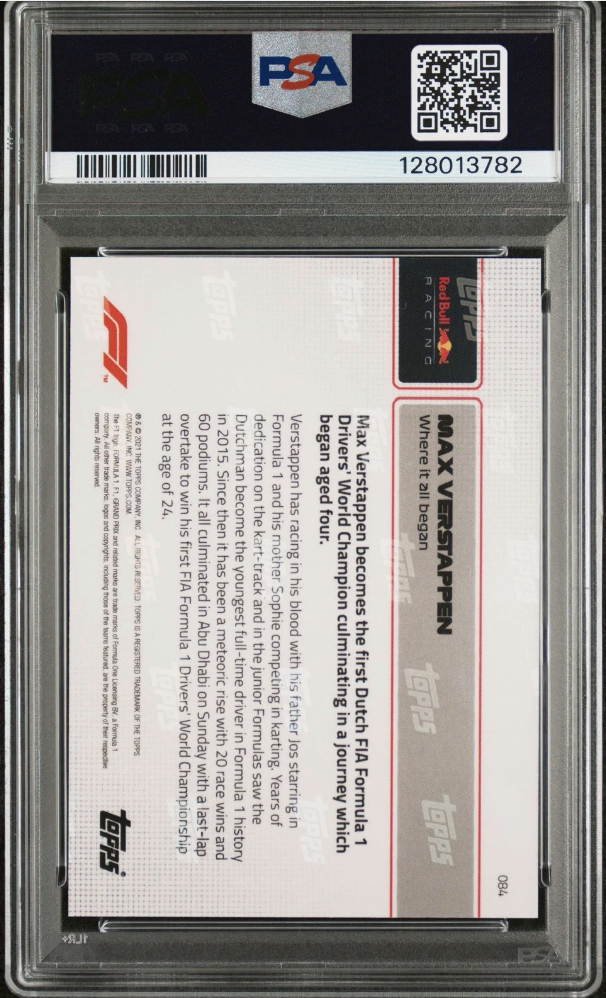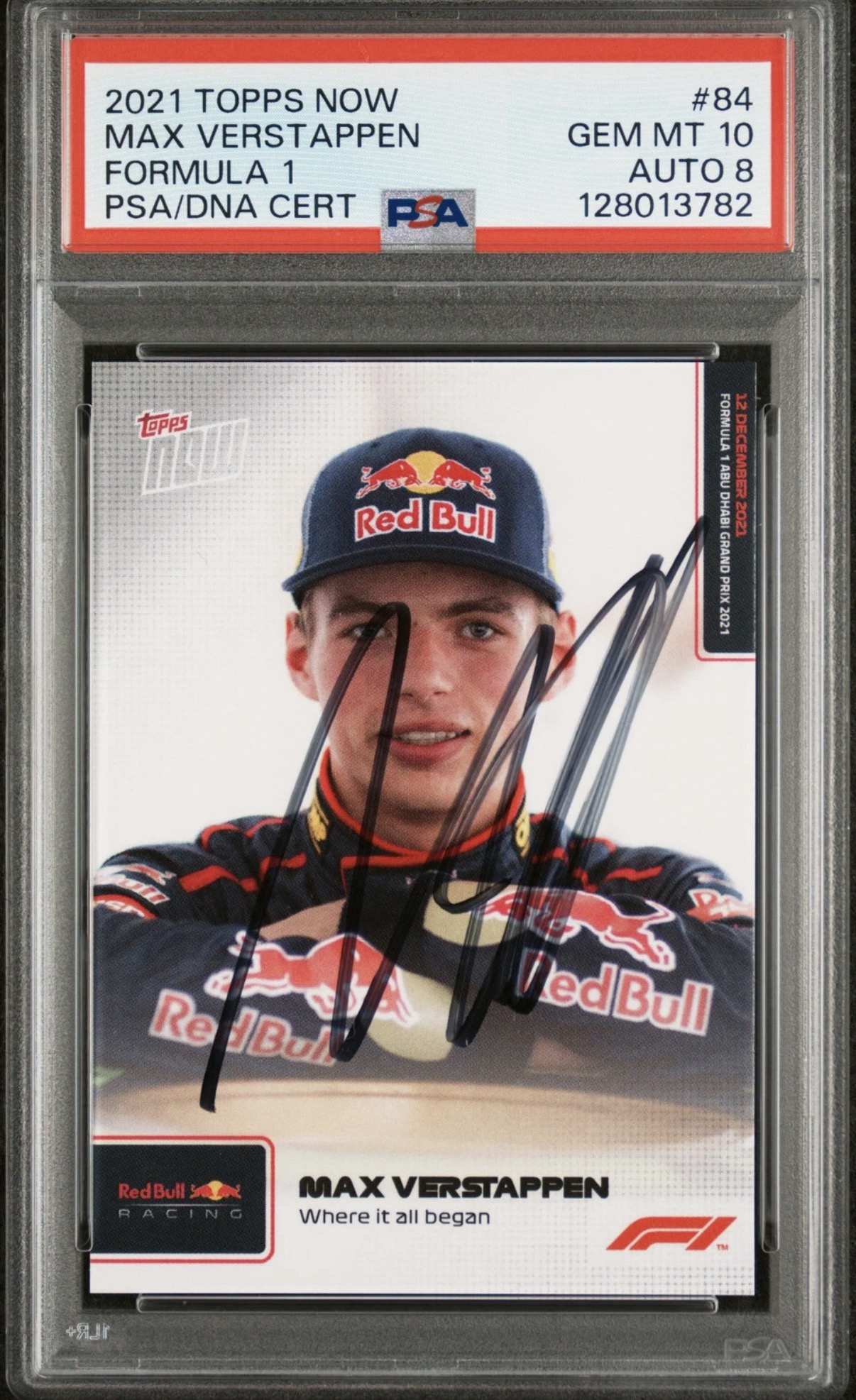 2021 Topps Now Max Verstappen 红牛车队 F1 总冠军车手 马克斯 维斯塔潘 四冠王 “一切开始的地方”首冠青涩选图 围场签 卡签 签字 PSA10 完美品相 收藏必备