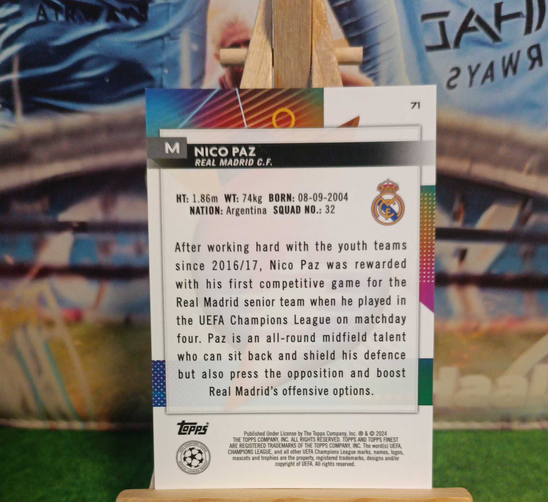 2024 Topps Finest Nico paz RC 欧冠 皇家马德里 新秀RC 尼科 帕斯 帕兹 299编 紫折 阿根廷🇦🇷 梅西队友 科莫 过人王 状态火热 豪门猎物 卡品如图
