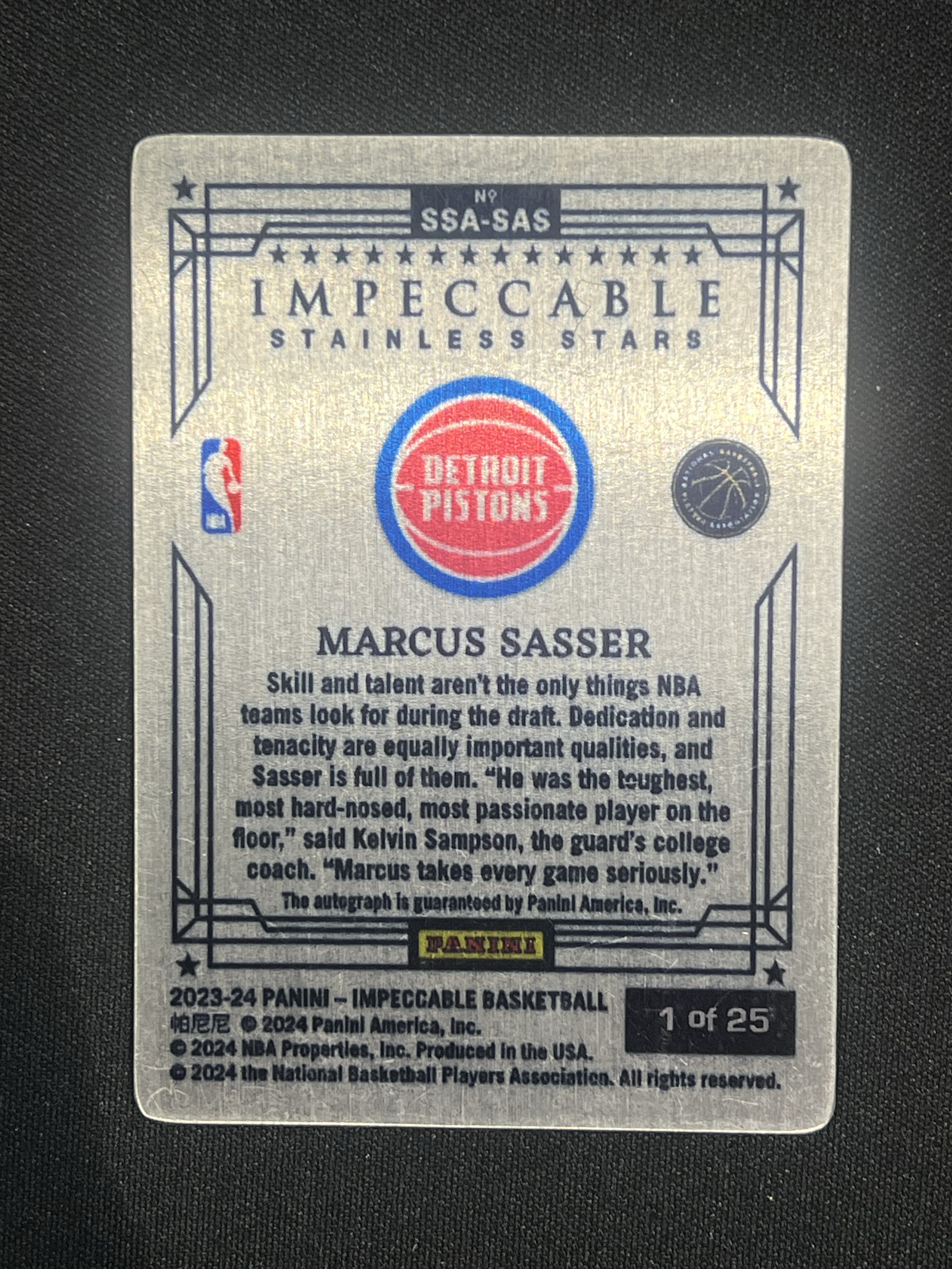【卡卡星拍卖】2023-24 Panini Impeccable Marcus Sasser RC 活塞 马库斯 萨瑟 1/99编 首编 新秀 签字 铁板 卡签 小真金系列 未来可期 卡品如图 熊