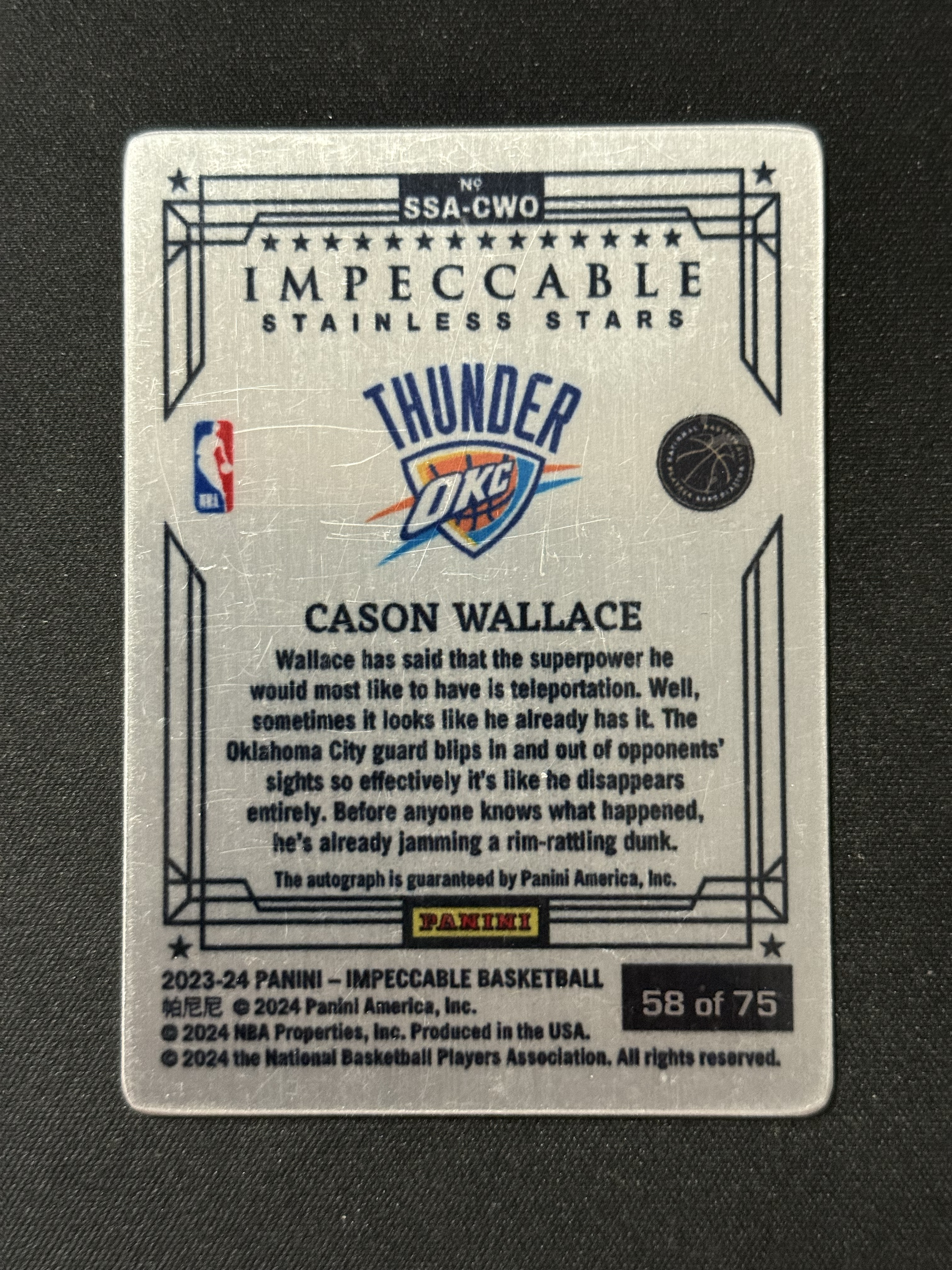 2023-24 Panini Impeccable Cason Wallace RC 卡森 华莱士 小真金 铁板 签字 卡签 58/75编 雷霆 实卡好看 潜力无限 值得收藏 西部第一