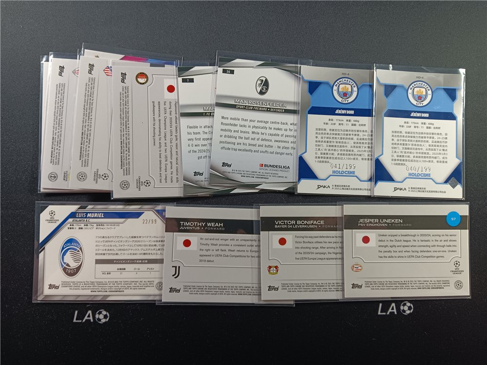 LA足球账号属于LA拍卖专注于足球的子品牌,因卡淘系统不支持跨号合并,所以分开发货计算邮费,寄售代卖咨询:laauction。卡品如图,请仔细看图,如果无图片特殊展示瑕疵均为通行品相,一般prizm optic 等系列薄卡的小划痕,国宝IMM等系列厚卡的小白边小白角,都属于通行品相。艺术家 品控勿扰。中标后请等我们合并订单再点确认付款。付款时卡淘留言说明累计或邮寄(我们会按照留言的先后顺序处理发货,请不要反复留言以免耽误给您回复)为了方便结算和卡片的累计查找,我们只合并当天的订单。邮费-顺丰(默认陆运):北京13元,非偏远外地18元,新疆西藏等偏远只发到付!超重只发到付!1000元以上的订单,建议买家自行保价,或用顺丰到付,所有快递未经保价,运输途中的损坏和丢失请于快递联系解决。(本店不支持任何普快发货,破损及丢失率太高)介意勿拍!中标可累计,累计时间2个月,每标累计金额不能超过500元,超过累计时间出现丢失或品相问题的,卡片问题由买家自行承担。累计的卡片请先付清卡款,然后卡淘上与我们联系操作,请于截标后3天转好,截标后3天未确认收到付款,一律卡淘投诉处理。