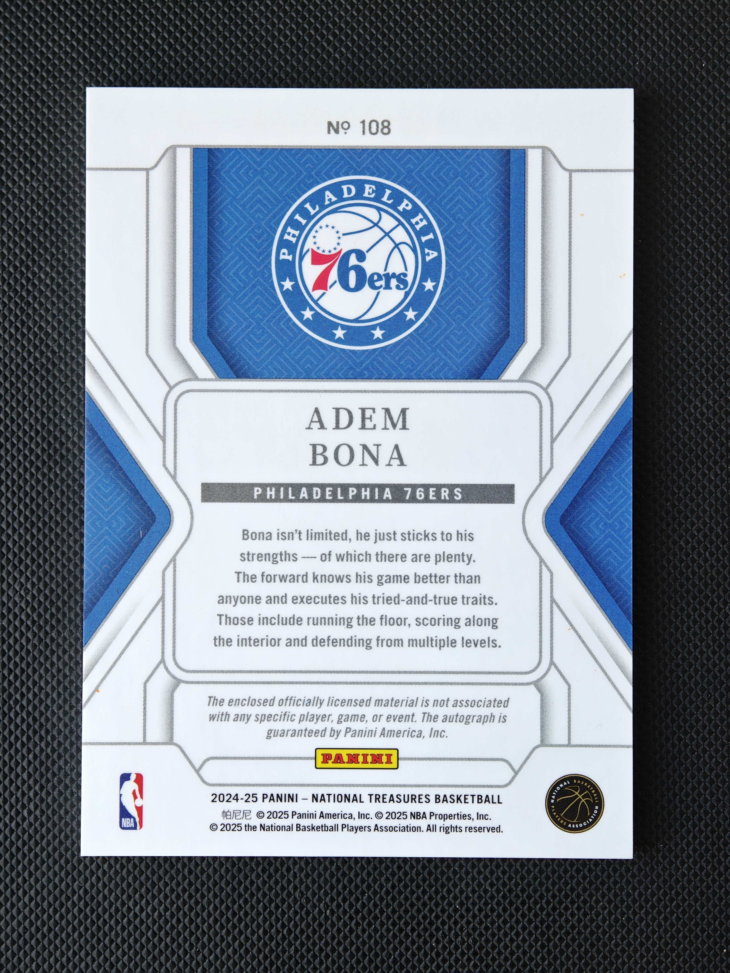 2024-25 Panini National Treasures Adem Bona RC 76人队首发新秀 阿德姆 博纳 75编国宝正RPA 亲笔卡签暴力切割 德拉蒙德恩比德受伤机会增加 卡品如图