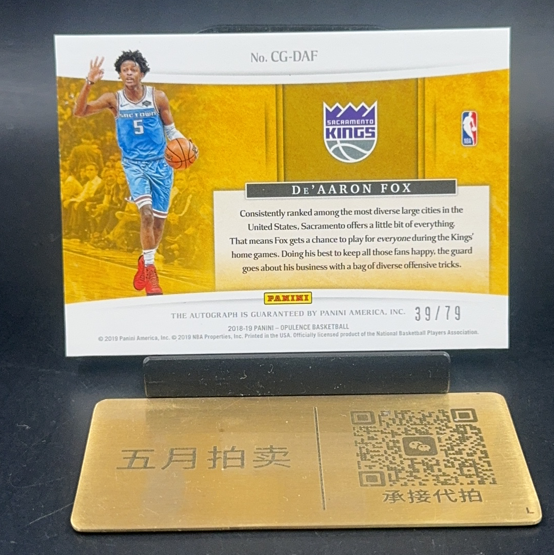 2018-19 Panini Opulence De Aaron Fox 【五月拍卖 顺丰空运】金书 达龙福克斯 City of Gold 签字 卡签 国王 马刺 79编 微瑕如图 呆Gzheng
