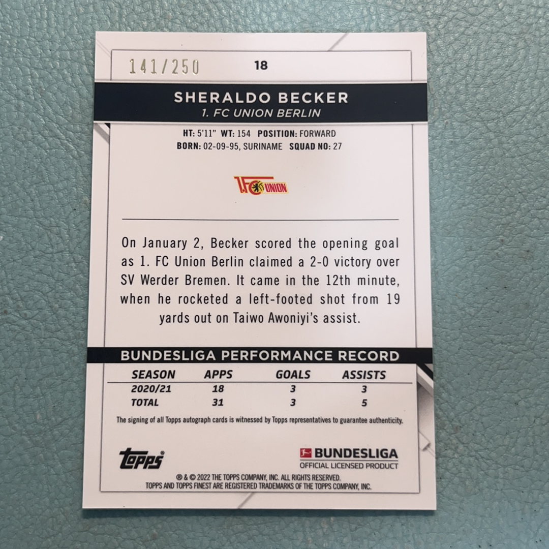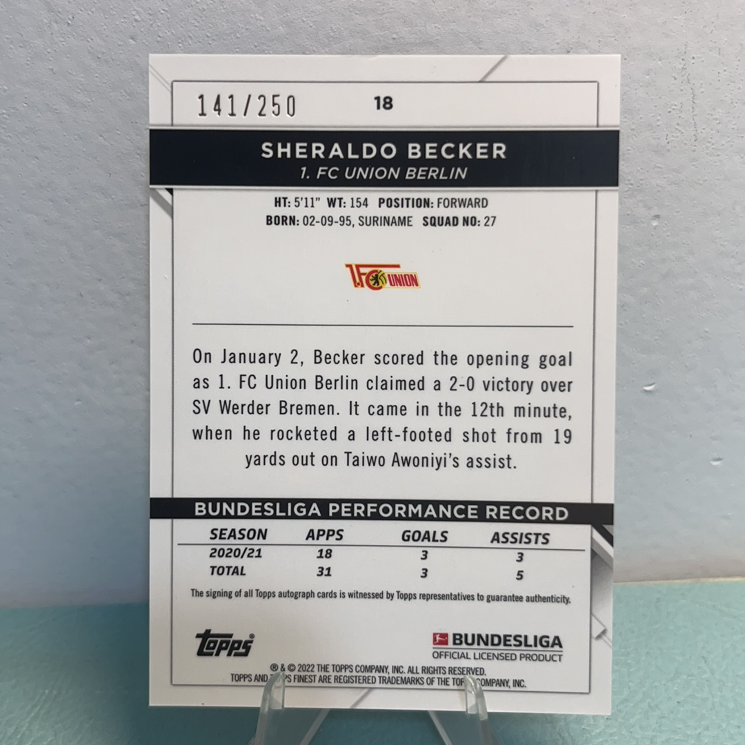 2022 Topps Finest SHERALDO BECKER 德甲 柏林联合 苏里南 贝克尔 签字 签名 250编 银折 折射 卡品看图ch2