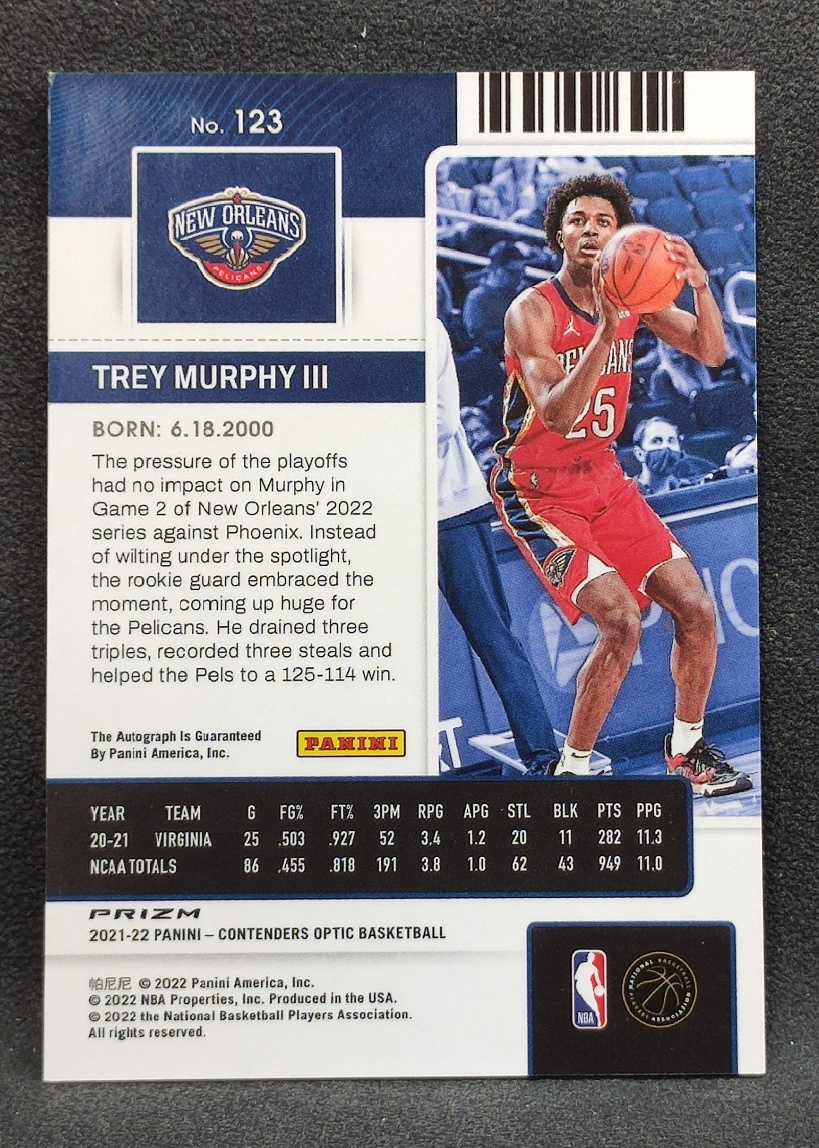 Trey Murphy III 特雷墨菲 2021-22 Contenders Optic 球票 OP RC新秀 签字 卡签 银折折射 鹈鹕队 瑕疵见图