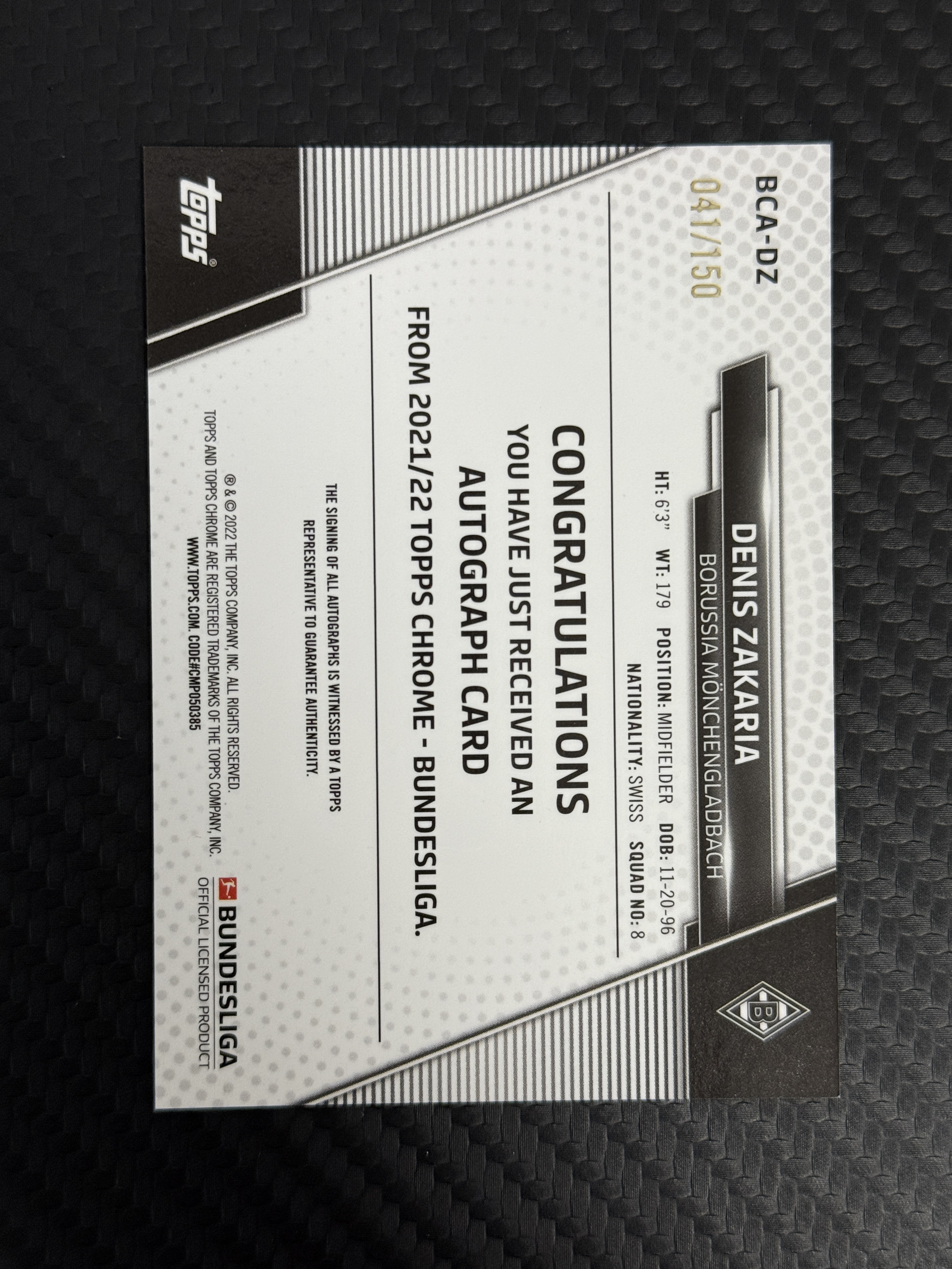 【包来拍卖】2022 Topps Chrome Denis Zakaria 德甲 TC 扎卡里亚 签字 150编 粉折 折射 卡品如图 小割割